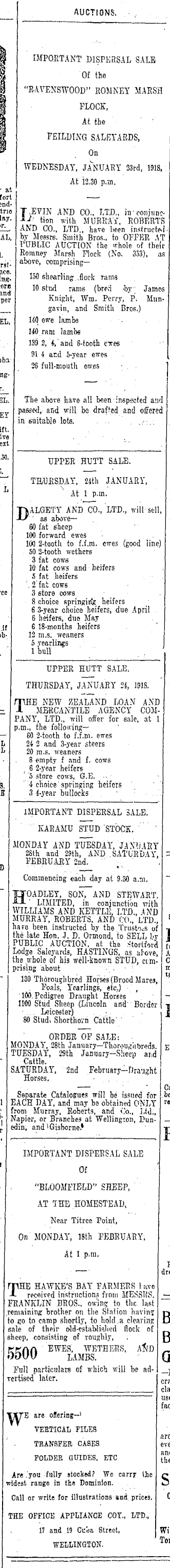 AUCTIONS. , IMPORTANT DISPERSAL SALE Of the "R-AVENSWOOD" ROMNEY MARSH FLOCK, At the FEILDING SALEYARDS, On [ WEDNESDAY, JANUARY 23rd, 1918, At 12.30 p.m. LEVIN AND CO., LTD., inconjunction with MURRAY, ROBERTS AND CO., LTD., have I teen instructed by Messrs. Smith Bras., to OFFER AT PUBLIC AUCTION the whole of their Romney Marsh Flock (No. 353), as above, comprising— 150 shearling..flock Tarns 10 stud rams (bred 'by ; James Knight, Wm. Perry, P. Mungavin, and Smith Bros.) 140 owe lambs . 140 ram lambs 139 2, 4,' and 6-tooth eires 91 4 and 5-year ewes 26 full-mouth owes • The above have all been inspected and passed, and will be drafted and offered in suitable lots. , UPPER HUTT SALE. THURSDAY, 24th JANUARY, At 1 p.m. D ALGETY AND CO., LTD., will sell, ' as above— 60 fat sheep 100 forward ewes 100.2~tooth to f.f.m. ewes (good line) 50 'i-tooth wethers 3 fat cows 10 fat cows and heifers 5 fat heifers .2'fat cows 3 6tore cows • _ • 8 choice springitCc heifers 6 3-year choice heifers, due April 6 heifers, due May 6 18-months heifers 12 m.s. weaners 5 yearlings 1 bull ( UPPER HUTT SALE. j THURSDAY, JANUARY 24, 1918. mHE NEW ZEALAND LOAN ANI A MERCANTILE AGENCY COM PANY, LTD., will offer for sale, at 1 p.m., the following 60 2-tooth to f.f.m. ewes 24 2 and 3-year steers 20 m.s. weaners 8 empty f and f. cows . 6 2-year heifers ' '5 store cows. G.E. ' 4 choice' springing heifers 3 4-year bullocks . IMPORTANT DISPERSAL SALE. KARAMU STUD STOCK. MONDAY AND TUESDAY, JANUARI 28th and 29th, AND SATURDAY FEBRUARY 2nd. Commencing each day at 9.30 a.m. HOADLEY, SON, AND STEWART LIMITED, in conjunction witl WILLIAMS AND KETTLE. LTD., ANI MURRAY, ROBERTS, AND CO., LTD. ha?e been instructed by the.Trusties u the late Hon. J. D. Ormond, to SELL l> PUBLIC AUCTION, at the Htortfor Lodge Saleyards, HASTINGS, as atovf the whole of his well-known STUD, cim prising about 130 Thoroughbred Horses (Brood Mares Foals, Yearlings, etc.) , ' 100. Pedigree Draught Horses 1100 Stud Sheep (Lincoln and' Borde • ... Leicester) 80 Studi Shorthorn Cattle' ' ORDER OF SALE: MONDAY, 28th January— I Thoroughbreds TUESDAY, 29th January-Sheep ar. Cattle. SATURDAY, 2nd February— Draugh Horses, Separate Catalogues will be issued fc EACH DAY, and may ho obtained ONL" from Murray, Roberts, and Co., Ltd Napier, or Branches at Wellington, I>ur edin, and 'Gisborne.' IMPORTANT DISPERSAL SALE Of "BLOOMFIELD" SHEEP, AT THE HOMESTEAD, Near Titree Point, On MONDAY, 18th FEBRUARY, At 1 p.m. mHE HAWKE'S BAY FARMERS 1 hi A received instructions from MESSTtt FRANKLIN BROS., owing to the lai remaining brother on the Station bavin to go to camp shortly, to hold,a clearir sale of their old-established flock ( sheep, consisting of roughly, PKAA 1 EWES, WETHERS, A?f Ot)UV LAMBS. Full particulars of which will be ai verted later. . 1 are offering- 1 VERTICAL FILES TRANSFER CASES FOLDER GUIDES, ETC Are .'you fully stocked? YFe carry (1 widest range in the Dominion. Call or write for illustrations and prici THE OFFICE APPLIANCE COT.. LTD, 17 and 19 Cu'oa Street, WELLINGTON.