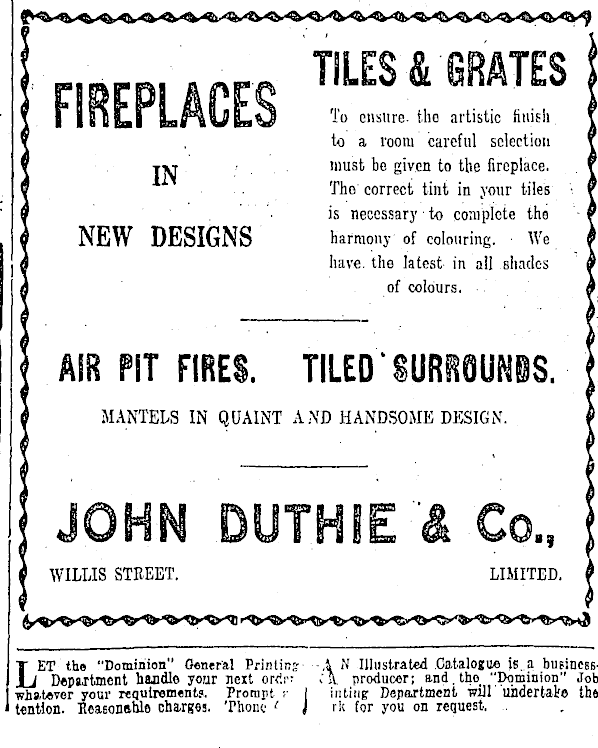 I: _ . TILES & GRATES J '' ll ifllLl -° ensure, the artistic finish '[ I . to a room careful selection 1 ( w must be given to the fireplace. 1 .1 . The' correct tint in your tiles • ' ' " (' is necessary to complete the -i' INEW DESIGNS harmony of colouring. We P (i have, the latest in all shades <i of colours. 11 —" f | AIR PIT FIRES. TILED SURROUNIS. I I MANTELS IN QUAINT AND HANDSOME DESIGN. (>■ \ ' ! JOHN DUTHIE "A Co., 11 WILLIS STREET. LIMITED, f J LET the "Dominion" General Printing- ,4 N Illustrated Catalogue is..a buEincßßDepwtment handle your next ordr producer; and.tho t "Dominion" Job whatever your requirement.". Prompt i- I in ting Department will' undertake thft tentlon. Reasonable charges. Thonc ' J rk tor you on request.