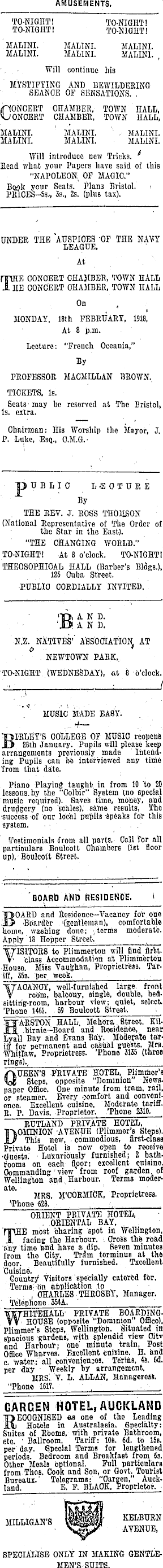 AMUSEMENTS. TO-NIGHT I TO-NIGHT! TO-NIGHT! TO-NIGHT! MALINI. MAIiINI. MALINI. MALINI. MALINI. MALINI. , • Will continue his mystifying and bewildering seanoe of sensations. , (ponoert chamber, town hall, Concert chamber, town hall, malini. ' malini. ' . malini. malini. malini. malini. Will introduce now Tricks. * Eead what your Papers have said of thie "NAPOLEON. OF MAGIC." Book your Seats. Plan 3 Bristol. > MUOES-55,, 35., 2s. (plus tax). UNDER THE AUSPICES OF THE NAVY LEAGUE, At . mHE CONCERT CHAMBER, TOWN HALL A HE CONCERT OHAMBER, TOWN HALL On MONDAY. 18th FEBRUARY, 1918, At 8 p.m. Lecture: "French Oceania," By PROFESSOR MACMILLAN BROWN. TICKETS. Is. Seats may ho reserved at The Bristol, Is. extra. Chairman: His Worship the Mayor, J. P. Luke, Esq., C.M.G."PUBLIC L'BOTUKE 1 ' By THE EEV. J. ROSS THOMSON (National Representative of The Order of the Star in the East). "THE CHANGING WORLD." TO-NIGHT! At 8 o'clock. TO-NIGHT! THEOSOPHIOAb HALL (Barber's Bldgs.), 125 Ouba Street. -PUBLIC OORDIALLY INVITED. BAND. AND. N.Z. NATIVES'' AT . NEWTOWN PARK, i TO-NIGHT, (WEDNESDAY), at 8 o'clock. '~ ■ ; / MUSIC MADE EABY. BIRLEY'S COLLEGE OF MUSIC recnen'B 28th January. Pupils will please keep arrangements previously made Intending Pupils can be interviewed any time from that date. Piano Playing taughb in from 10 to 20 lessons.by the "Colbir" System ino special music required). Saves time, money, and drudgery (no scales), sMne results, The ■success of our local pupils speaks foT this System. ■ . . Testimonials from all parts.- Call for all particulars Boulcott Ohombers (let floor up), Bbulcott Street. BOARD AND RESIDENCE. ( BOARD and Residence—Vacancy for one ■Boarder '(gentleman), comfortable home, va-shing done; v*- 6 ™ B moderate. Apply 18 Hopper Street. ' XTISITORS to Plimmertou will find flrtt. V , class Accommodation at Plimmerton -House. MiJs Vaughim, Proprietress. Tariff, 35a. per Week. . AOANOY, •well-furnished large, front ; room, balcony, single, double, bed-sitting-room, harbour view; quiet, select. 'Phono 1461. .59 Boulcott Btreat. ARSTON. HALL. Mahbra. Street, Kil.birnie—Board and Residence,, near Lyall Bay and Evans Bay. Moaerate tariff for permanent and casual guests. Mm. Whitlaw, Proprietress. 'Phone 3135 (three rings).,. QUEEN'S PRIVATE HOTEL, Plimmer'a Steps, opposite "Dominion" News, paper Office. Oiie minute from tram, rail, or steamer. Every comfort and convenience. Excellent cuisine. Moderate tariff. B. P. Davis. Proprietor. 'Phone 2310. RUTLAND PRIVATE HOTEL, DOMINION -AVENUE (Plimmor's Steps). Thie new, , commodious, first-class Private Hotel is hdw open to receive •Ctneets. ■ Luxuribusly furnished; 2 bathrooms on each floor; excellent cuisino. Commanding ■view from roof garden, of Wellington and Harbour. Terms moderMRS. M'CORMICK, Proprietress. 'Phone 628. ■.' . . ... :.. . . ORIENT PRIVATE HOTEL, . ORIENTAL BAY. . : rE most bharihg spot in Wellington, facing the Haroour. ■. Cross the road any time and have a dip. Seven minutes from the City. Trim terminus at the door. Beautifully furnished. Tmellenl Cuisine. Coiintrj' Vieitors specially- catered for. Tcrniß- on dbplication to i CHARLES THROSBY, Manager. Telephone. 354 A. ' WHITEHALL' PRIVATE BOARDINGHOUSE (opposite "Dominion" Offlco). Plimmer's Steps, Wellington. , Situated in spacious gardens, with splendid view Oitv and Harbour; one' minute train, Post Office Wharves. F/icellent cuisine. H. and c water: aU convenienjoa. Terms, 4a. 6a. per day ■ Weekly by arrangement. MRS! V. L. ALLAN, Manageress. "Phone 1617. . . GARC'E'N HOTEL, AUCKLAND RECOGNISED as one of the Leading Hotels in Australasia-. Specialty: Suites of Rbomß, with private Bathroom, etc. ' Ballroom. Tariff: 10b. 6d. to 15b. per day. Speoial Terms for lengthened, periods. Bedroom and Breakfast from 6s. Other Meals optional. Full particulars from Thoe. Cook and Son, or Govt. Tourist Bureaux.' Telegrams: "Oargen," Auckland; E. F. BLACK, Proprietor. MILLIGAN'S Pi KELBURN *^*fndr k -AVENUE, SPECIALISE ONLY IN MAKING GENTLEMEN'S SUITS.