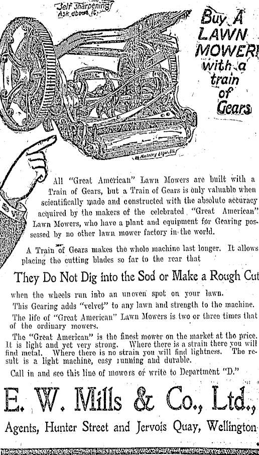 J fl6f ill "Great American" Lawn Mowers are built with a • &. jf I'rnin of Gears, but a Train of Gears is only valuable frhen scientifically wade and constructed with the absolute accuracy &&vW|7/ acquired by the makers of the celebrated . "Great American" Wmik Lawn Mowers, who have a plant and equipment for Gearing pos-, ||§§r sessed by no other lawn mower factory in. the world. H§r A Train Tf Gears makes the wholo machino last longer. It allows ifr placing the cutting blades so far to the rear that They Do Not Dig into the Sod or Make a Rough Cut when tho wheels run into an unoveri spot on your lawn. This Gearing adds "velvet" to any lawn iintl strength to tho machine. The life of "Great American" Lawn Mowers is two or three times that of the ordinary mowers. The "Great American." is the finest mofrbr on the market at tho price. It is light and yet very strong. \Vhere there is a strain there you will find metal. Where thoro is no strain you will find lightness. The result is a light machine, easy lumiing and durable. Call in and seo this line of niowors or write to Departineht "D." E W. Mills & Co., Ltd^ , Agents, Hunter Street and Jervois Quay, Wellington-;