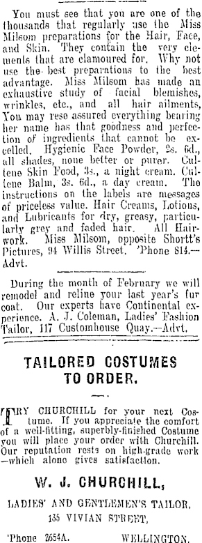 You must see that you nro one of the thousands that regularly use (ho Miss ililsom preparations for the Hair, Face, and Skin. They contain the very cleuienls that are clamoured for. Why not use the- best preparations to the best advantage. Hiss Milsom has made an exhaustive study of facial blemishes, wrinkles, etc., and all hair ailments, You may me assured everything , bearing iier nnme has that goodness and perfection of ingredients that cannot bo excelled. Hygienic Face Powder, 2s. (id., all shades, none better or purer. Culleno Skin Food, 35., a, night cream. CulIcne Balm, 3s. (id., a day cream. The instructions on the labels nro messages of priceless value. Hair Creams, Lotions, and Lubricants for dry, greasy, particularly grey and faded hair. All Hairwork. Miss Milsom, opposite Shortt's Pictures, 94 Willis Street. 'Phone 814.— Advt. During the month of February we will remodel and reline your last year's fur coat. Our experts have Continental experience. A. J. Coleman, Ladies' Fashion Tailor, 117 Customhouse Quiiy.-Advt, TAILORED COSTUMES TO ORDER. rjIRY CHURCHILL for your nezt CoeJL tumo. If you appreciate the comfort of a well-fitting, superbly-finished Costume you will place your order with Churchill. Our reputation rests on high-grade work —which alono gives satisfaction. W. J. CHURCHILL, LADIES' AND GBNTRiMEN'S TAILOH, 135 VIVIAN RTBBKT, 'Phone Z654A. WELLINGTON.