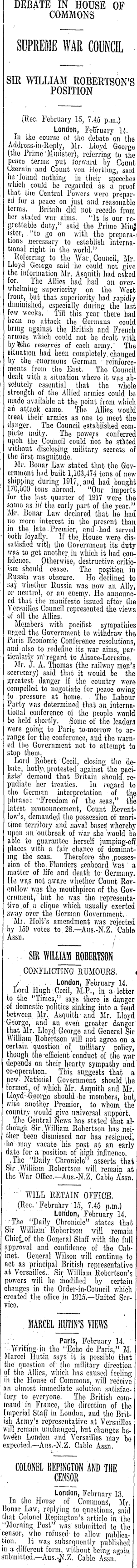 DEBATE IN HOUSE OF COMMONS SUPREME WAR COUNCIL \ SIR WILLIAM ROBERTSON'S POSITION , (Rec. February 15, 7.45 p.m.) I London, February LJ. ) In the course of the debate on the Addicss-in-Reply, Mr. Lloyd George (the Prime •Minister), referring to the pt-uce terms put fonvard by Count Ozernin and Count von Hertling, said Impound nothing in their speeches . which could be regarded as a proof k that tile Central Powers were prepar- . Ed for a peace on just and reasonable j terms. Britain did not recedo from j her stated war aims. "It is our re- I j grettable duty," said the Prime Miu| I ister, "to go on with the prepara-/ >. tions necessary to establish interna- > tional right in the world." deferring to the War, Council, Mr. Lloyd George said he could not give the information Mr. Asquith had asked for. The Allies had had an overwhelming superiority on the West - front, but that superiority had rapidly 1 diminished, especially during the last 3 few weeks. Till this year there had s bet.n no attack the Germans could ) bring against the British and French . armies which could not be dealt with . byJStliG reserves of each army.' The situation had been completely, changed 3 by the enormous German "reinforce--3 ments from the Bast. Tho Council c dealt with a situation where it was ab- ) Boiutely essential that the whole ; strength of the Allied armies could be 3 made available at the point from which ah attack came. Tho Allies would treat their armies as one to meet the danger. The Council established complete unity. The powers conferred upon the Council could not be stated without disclosing military secrets of the first magnitude. Mr. Bonar Law stated that the Govj crnnicnt lwd built 1,163,474 tons of new p shipping during 1917,, and had bought ; 170,000 tons abroad. "Our imports for tiie last quarter of 1917 were the same as.iii the early part of the year." Mr. Uonar Law declared that he had 110 more interest in the present than in the. lato. Premier, and had served ;•• both loyally. If the. House were dis-1 1 satisfied with the Government its duty 5 was to get another in which it had con- ' lidonce. Otherwise, destructive criticJ ism should cease. The position in 3 Russia was obscure. He declined to say whether Russia was now an. Ally, or neutral, or an enemy. He announced that the manifesto issued after tlie Versailles Council represented the views of all tho Allies. Members with pacifist sympathies urged the Government to withdraw the Paris Economic Conference resolutions, 7 and also to redefine its war aims, parf' ticularly m" regard to Alsace-Lorraine. Mr. J. A. Thomas (the railway men's . secretary) said that it would be tho [ greatest danger if the country w r ere compelled to negotiate for peace owing to . pressure at home. The Labour Party was determined that an international conference of the people would \ be held shortly. Some of the leaders ', were going to Paris to-morrow to ari. range for the conference, and tho warned tho Government not to attempt to stop them. Lord Robert Cecil, closing tho de- . bate, hotly\ protested against the pacifists' demand that Britain should, repudiate her treaties. In regard to tho German interpretation of the phrase: "Freedom of the seas," the latest pronouncement, Count Iteventlow's, demanded the possession of maritime territory and naval bases; whereby '. upon an outbreak of war she would be able to guarantee herself jumping-off places with a fair chance of dominating the seas. Therefore tho .possession of tho. Flanders seaboard was a matter of life and death to Germany. He was not aware whether Count Revon How was the mouthpiece of the Government, but he was the representative of a clique which usually exerted sway over the German Government. Mr. Holt's amendment was rejected by 159 votes to.2B.—Aus.-N.Z. Cable Assn. / . / SIR WILLIAM ROBERTSON . CONFLICTING RUMOURS. i j' , London, February 14. Lord Hugh Cecil, M.P., in a-letter to the ''Times," says there is danger of domestic politics sinking into a feud between Mr., Asquith and Mr. Lloyd George, and an even greater danger that Mr. Lloyd George and General Sir William Robertson will not agree on a certain question of military policy, though the -efficient conduct of the war depends on their hearty sympathy and co-operation. This suggests that a new; National Government should ibe formed, of which Mr. Asquith and Mr. Lloyd-Georgo should'bo members, but, with another Premier, to the country would give universal support. The Central News has stated that although Sir.William Robertson has neither been dismissed nor has resigned, 'ho' may vacate his post at an early date for a position of high influence. , The "Daily Chronicle" asserts that Sir William Robertson will remain at the War Office.—Aus.-N.Z. Cable Assn. ■ ' -' WILL RETAIN OFFICE. (Rec.' Februarv 15, 7.45 p.m.) London, February 14. ' The "Daily Chronicle" states that Sir William' Robertson -will remain Chietof the General Staff with the full approval and confidence of the Cabinet. General Wilson will continue to act as principal British representative at Versailles'. Sir William Robertson's powers will be modified by certain changes in the Order-in-Council which created the office in 1915.—United Service. MARCEL MIN'S VIEWS Paris, February 14. ' Writing'in tho "Echo dc Paris," M. Marcel Ilutin says' it is possible that the question of the military direction of tiie Allies, which has caused feeling iii the House of Commons, will receive an almost immediate solution satisfactory to everyone. Tho British command in France, the direction of tho Imperial Staff in London, and the British Army's representative at Versailles win remain unchanged, but changes between London and Versailles may bo expected.—Aus.-N.Z. Cablo Assn. * COLONEL REPINGTON AND THE CENSOR London, February 13. In the House of Commons", Mr. I Hoiiar^Law, replying to questions, said that Colonel Repington's articlo in the 1 "Morning Post" was submitted to the ; c