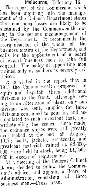 Melbourne, February 16. The report of the Commission which has been inquiring into the management of the Defence Department states that enormous losses are likely to be sustained by the Commonwealth owing to the serious mismanagement if the Department. It recommends the reorganisation of the wholo of the business affairs of the Department, and calls for the appointment of a board of expert 'business men to take full control. The policy of appointing men trained only as soldiers is severely criticised. . It is stated in the report that in 191") tho Commonwealth proposed to equip and dispatch three additional divisions to the front. Although, owiri» to an alteration of plans., only one division was sent, supplies ior three divisions continued to pour in, and accumulated to such an (extent that, notwithstanding the issues since made, the ordnance stores were still greatly overstocked at the end of August, 1917; boots, jackets, and rreatcoat material, valued at £2,000,000, wero held in stock, beinr; £1,200,000 in excess of requirements. _ At a meeting of the Federal Cabinet it was decided to follow- the Commission's advice, and appoint a Board ot Administration, consisting of three business men—Press Assn.