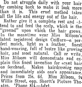• Bo not struggle daily with your hair by combing back to make it look more than it is. This cruel method takes all the life and energy oul of the hair. Rather give it a complete rest and -.t----tond to and feed the scalp, which is the "ground" upon which the hair grows. In the meantime wear Miss Milsom's "latest registered design Coiffure—a' perfect match, light as a feather, finest band-weaving, full of lustre like'growing hair, and most natural. Call or write. Miss Milsom will demonstrate and explain this finest invention for tican.t hair on forehead. Makes hairdressing easy and immediately aids one's appearance. Prices from 255. 6d. Miss Milsom, 91 Willis Street, opp. Shortt'e Picture Theatre. 'Phone 814.—Advt.