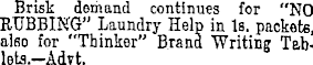 Brisk demand continues for "NO RUBBING" Laundry Help in Is. packets, also for "Thinker" Brand Writing Tablets.—Advt.