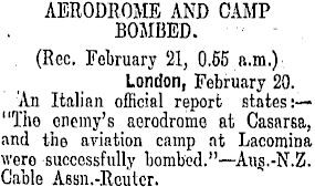 AERODROME AND CAMP BOMBED. (Rec. February 21, 0.55 a.m.) London, February 20. An Italian official report states:— "Tho enemy's aerodrome at Casarsa, and the aviation camp at Lacomina wero successfully bombed."—Aug.-N.Z. Cable Assn.-Reuter.