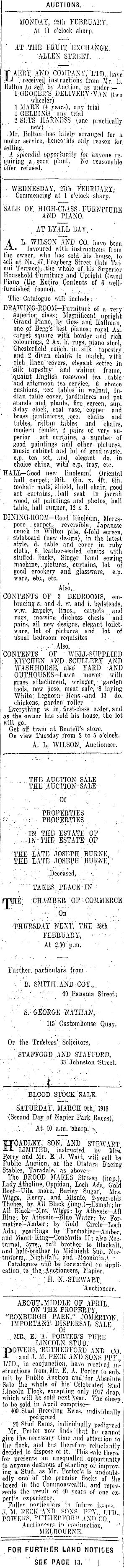 AUCTIONS, MONDAY, 25th FEBRUARY, At 11 o'clock sharp. AT; TIIE FEU IT EXCHANGE. ALLEN STREET. .. T AERY ANJ) 'COMPANY,' LTD., have' ' '.-received instructions' from .Mr. E. Bolton ; tu sell by Auction,'as under:— 1 :.GEQCEIVS DELIVERY ■VA N (two wheeler)' 1 MARE (1 years), any trial 1 GELDING. any trial • . . 2 SETS HARNESS (one practically hew) Mr. Bolton has lately* arranged for a motor service, hence his only reason for selling. A splendid, opportunity for anyone requiring a,good plant, No reasonable offer refused. • WEDNESDAY, 27th FEBRUARY, Commencing at i o'clock sharp. SALE OF. HIGH-CLASS . FURNITURE AND PIANO. , AT LYALL BAY. A L. WILSON AND CO. have been -£*-• favoured with instructions from the owner, who has sold his house, to sell at No....47..Freyberg Street (late Tainui Terrace),-.the whole 'of his Superior Household Furniture and Upright Gnaiid Piano (the Eiitire Contents of 6 wellfurnished rooms). •. The • Catalogue will include: DRAWING-ROOM—Furniture of a very superior class: Magnificent upright Grand Piano,, by Goss and Knllman, oiio of Begg's.'best pianos; royal Ax! .. carpet square Willi' border and rich colourings', 2 Ax; h. r.ugs, piano stool, Chesterfield ,coiich. in, silk' tapestry and 2 divan chairs to match, with •rich, linen -covers, elegant settee in • silk tapestry ' and walnut frame, quaint English rosewood tea . table and afternoon tea service, li choice cushions, ".cc, tables" in walnut, Indian table cover, jardinieres and pot stands and plants, fire, screen, sup. 8-day clock, coal vase, ■ copper and ' ' brass .jardinieres, ,occ. chains and tables, .rattan .tables and chairs, modern fender, 2 pairs of very superior art curtains,..a • number of good paintings and' <Jther -"pictures, music cabinet and lot of good music, o.p. ten set, /.nd elegant do. in choice china, with' e.p. tray, etc. HALL—Good new linoleum! Oriental halt carpet; 10ft. Gin. x. 4ft. 6ih. mohair mats,' shield, hall chair, good art -curtains,.. hnll seat . in jarrah •wood, oil paintings and photos, hall table, ball runner, 12 x 3. DINING-ROOM—Good linoleum, Merzapore . carpet,; reversible-. Japanese couch in Wilton pile, 4-fold screen, . sideboard (new design), in the latest, style, d. table and cover in ruby cloth,- 6- leather-seated chairs with stuffed, backs, Singer hand sewing machine,. pictures, curtains, lot of good crockery and glassware, e.p. ware, etc,, etc, Also,. CONTENTS OF .1 BEDROOMS, embracing s. and d. w. and i. bedsteads, w.w. .kapoks, linos., carpets and rugs, massive duchess chests and pairs, all new designs, elegant toiletware, lot of pictures, and lot of usual bedroom requisites .. 'Also, . CONTENTS ' OF WELL-SUPPLIED KITCHEN AND . SCULLERY AND WASIIHOOSE,' also YARD AND OUTHOUSES—Lawn mower with grass' attachment, ; wringer, garden tools, now hose, meat safe, ; 8 laying White; Leghorn- Hens -and 13 do. chickens, garden roller - Everything is in,, first-class o.'der, and as the owner has sold his house, the lot will go. Get off tram at Boutell's store. On view Tuesday from 2 to 5 o'clock. A. L. WILSON, Auctioneer. THE AUCTION SALE THE..AUCTION' 'SALE Of ~ ' I PROPERTIES PROPERTIES , 7 IN THE ESTATE'OF' ~ -IN THE ESTATE OF -THE LATE JOSEPH BURNE, : THE LATE JOSEPH' BUPE, ' ; .Deceased, . • .* TAKES. PLACE •IN • : rjTHE; CHAMBER OF * COMMERCE ' \ O n -THURSDAY NEXT,' THE 28th FEBRUARY, - At 2.30 p.m. Further, particulars from - - ' B. SMITH. AND-C0Y.,.. -39 Panama Street; ■ S.- GEORGE NATHAN, 115' Customhouse Quay. Or the Trifstees' Solicitors, . .STAFFORD AND STAFFORD, 33 Johnston Street. . li BLOOD. STOCK SALE. : SATURDAY. MARCH 9th, 1918 (Second .Day of Napier Park Races), At 10 a.m. "sharp.' \ HOADLEY,' SON, AND STEWART LIMITED, instructed by Mrs'. Perry and Mr. E.' J. Vl'att, wili sell by Public Auction, at the. Otatara Racing Stables, Taradale.' as above— The BROOD MARES Stressa (imp.), Lady Atholine, Oppidan, Loch Ada, Gold Reef—Uila mare,' Barley Sugar', llrs. Wigg6, Kerry, and Misnic, 2-year-olds Thebea, by, All Black .(imp.V-rEsmah'; bv All Black—Mrs. Wig'gii; by Athenic—All Blue; by Athenic—Blue 'water; by For-mative:-Amber; by Gold Circle—Loch Ada; yearlings by "Formative—Amber, arid Maori Kiiig—Concordia II; also Nocturnal, .syrs.-, full brother to lllackall, and half-brother to Miduight Sun, Noe-' tuit'orm,. Nightfall, and : ; Moon*oria,\ - Catalogues will be forwarded cn application, to the.;. Auctioneers, Napier. . H. N..STEWART, Auctioneer. ABOUT.MIDDLE OF APRIL ON THE PROPERTY, "ROXBURGH - PARK," cOMERTON - IMPORTANT. DISPERSAL SALE Of MR, E.'- A. PORTER'S PURE ' LINCOLN STUD; POWERS, RUTHERFORD AND CO and ,1. M. PECK AND SONS PPY.,' LTD., in conjunction, have received instructions from. Mr. E. A. Porter to submit by Public Auction and:for Absolute ■ Rale the whole of his' Cebbrated ' Stud Lincoln Flock, excepting only 1917 drop, which will be sold next year.' The' siieep to bo 6old in April comprise— 400' Stud Breeding Ewes, individually pedigreed 20 Stud Rams, individually pedigreed Mr. Porter now finds that' lie, cannot give the necessary time and attention to the flock, and has tlierehro reluctantly decided .to dispose of it. This sale tlieriv for presents an unequalled . opportunity to anyone desirous of starting or improving a Stud, as Mr. Porter's is undoubtedly one' of the premier flocks of the breed in the Commonwealth, and represents the result of 10 years of one expert's experience. Fuller nnrticnl.ars i'> fillII"" ,T. M. PECK 'AN 11 PONS PPV.. r.TD POWERS. •RUTIim'ORTi ,\XT> co ., Auctio"™rs jn enniiinclioij, ' - MELBOURNE. FOR FURTHER LAND NOTICES "" SEE PACE 13.