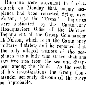 Humours were prevalent in Christchurch on Monday that enemy seaplanes had been reported Hying over iNelson, says the i J rcss.'' Inquiries were instituted by the Canterbury Headquarters Office ol' the Defence Department of the Group Cominandor at Nelson, which is in the Canterbury military district,- and ho reported that the only alleged witness of tho seaplanes was a lady who stated that she saw two risG from the sea and disappear among the clouds. As the result of his investigations tho Group Commander seriously discounted tho story as improbable.