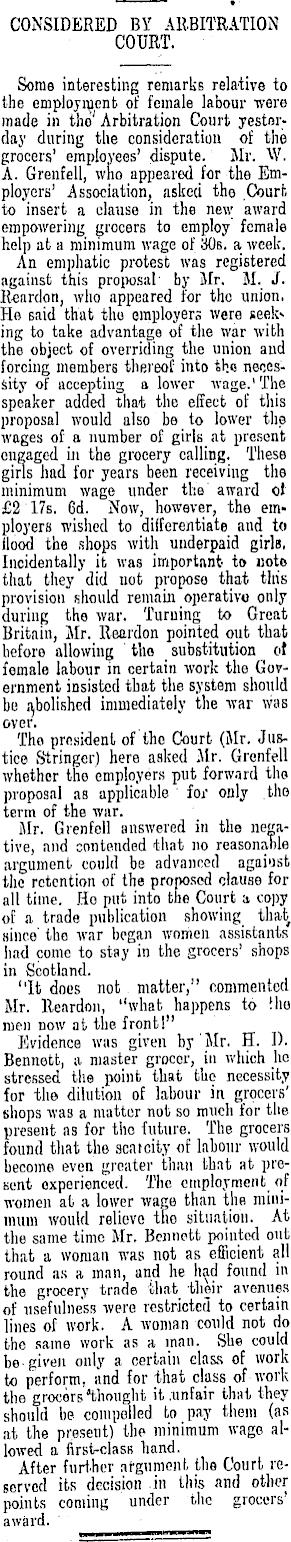 CONSIDERED BY ARBITRATION COURT. Some interesting remarks relative to the employment of female labour were made in the' Arbitration Court yesterday during the consideration of the grocers' employees' dispute. Mr. W. A. Grenfell, who appeared for the Employers' Association, asked the Court to insert a clause in the new award empowering grocers to employ female help at a minimum wage of 30s. a week. An emphatic protest was registered against this proposal' by Mr. M. J. Iteardon, who appeared for the union. He said that the employers were seek* ing to take advantage of the war with the object of overriding the union and forcing members thereof into the necessity of accepting a lower wage.' The speaker added that the effect of this proposal would also bs to lower the wages of a number of girls at present engaged in the grocery calling. These gins had for years been receiving the minimum wage under the award ot £2 17s. 6d. Now, however, the employers wished to differentiate and to flood the shops with underpaid girls, Incidentally it was important to note that they did not propose that this provision should remain operative only during the war. Turning to Great Britain, Mr. Reardon pointed out that before allowing the substitution of female labour in certain work the Government insisted that the system should be abolished immediately the war was over. The president of the Court (Mr. Justice Stringer) here asked Mr. Grenfell whether the employers put forward the proposal as applicable ' for only the term of the war. Mr. Grenfell answered in the negative, and contended that 110 reasonable argument could be advanced agaiust the retention of the proposed clause for all time. Ho put into the Court a copy of a trade publication showing that since' the war began women assistants had come to stay in the grocers' shops in Scotland. "It does not matter," commented Mr. lleardon, "what happens to (lie men now at the front!" Evidence was given by Mr. H. D. Bennett, a master grocer, in which lie stressed the point that the necessity for the dilution of labour in grocers' shops was a matter not so much for the present as for the future. The grocers found that the scarcity of labour would become even greater than that at present experienced. The employment of women at a lower wage than the minimum would relieve the situation. At the same time Mr. Bennett pointed out that a woman was not as efficient all round as a man, and he had found in the grocery trade that their avenues of usefulness were restricted to certain lines of work. A woman could not do the same work as a man. She could be given only a certain class of work to perform, and for that class of-work the grocors thought it .unfair that they should be compelled to pay them (as at the present) the minimum wage allowed a first-class hand. After further argument the Court reserved its decision in this and other points coming under the grocers' award.