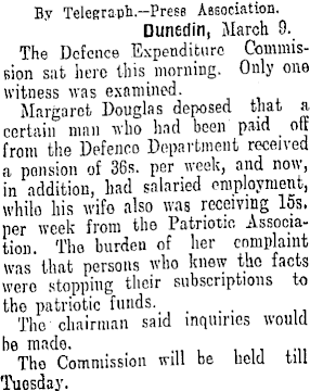 By Telegraph.-Presa Association. Dunedin, March 9. The Defence Expenditure Commission sat here this morning. Only one witness was examined. Margaret Douglas deposed that a certain man who had been paid off from the Defence Department received a pension of 365. per week, and now, in addition, had salaried employment, whilo his wife also was receiving 15s. per week from the Patriotic. Association. The burden of her complaint was that persons who knew the facts were stopping their subscriptions to the patriotic funds. . . . The chairman said inquiries would The Commission will be held till Tuesday.