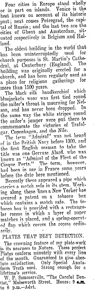 Four cities in Europe stand wholly or in part on islands. Venice is the best known ou account of its historic past; next comes Petrograd, the capital of Russia; and the last two are the cities of Ghent and Amsterdam, situated respectively in Belgium and HolThe oldest building in tho world that lias been uninterruptedly used for church purposes is St. Martin's Cathedral, at Canterbury (England), liio building was originally erected for a church, and has hcen regularly used as a place for religious gatherings for inoro than 1500 years. The black silk handkerchief which bluejackets wear was first tied round tho sailor's throat in mourning for Mson. and has never beon dropped, m the same way the white stripes round the sailor's jumper were put there to commemorate the victories of lratalgar, Copenhagen, and tho Nile. The tenn "Admiral" was not. heard nf in the British Navy before 1300, arid the first English seaman to take the title was one Gervase Alard. who was known as "Admiral of the Fleet of tho Cinque Ports." The term, however, had been in use in France some, years before the date here mentioned. Recently there appeared a pipe which carries a mptch safe in its $t*m. Working along these lines a New Yorker has secured a patent on a tobacco box which contains a match safe. The tobacco box is provided with a rectangular recess in which a layer of paper matches is nlaced, and a spring-operat-ed flap which covers the recess ordinarily. ' PLATES THAT DEFT DETECTION. The crowning feature of my plate-work is its nearness to Nature. These perfect Plates conform minutely with every line of the mouth. Guaranteed to cive absolute satisfaction. Only Special Anataform Teeth used. Strong enough for a lifetime's service. \V. P. Sommerville, "The Careful Denlist," Molesworth Street. Hours: 9 «ja. to 6 p.m.—Advt.