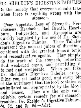 m. SHELDON'S DIGESTIVE TABULES Is the remedy that everyone should take when there is anything wrong with the stomach. Poor Appetite, Lobs of Strength, Nervousness, Headache, Bad Breath, Heartburn, Indigestion, and Dyspepsia are quickly banished liy the use of Dr. Sheldon's Digestive Tabules. These Tabules represent the natural juices of digestion, combined with the greatest known tonic and reconstructive agents. They simply do the work of the stomach, relieving that weakened organ, and uennitting it to rest and reouporate. when you take Dr. Sheldon's Digestive Tabules, everything you eat tales good, and every bit of tho nutriment that the food contains :s assimilated and impropriated by the blood and tissues. They are tho only fistie, reliable, certain remedy for all stomach troubles. Dr. Sheldon's Digestive Tabules, M. Si. and 2a. 6d.—Advt.