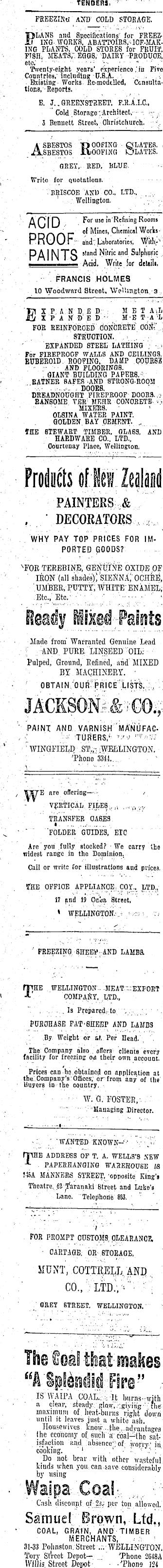 ■■■■~-. TENDERS,'-"' " -'■■'■■ FREEZING AJfD' COLD STORAGE. FLANS and Specifications' for FREEZING WORKS. ABATTOIRS/. I'OE-MAK-ING PLANTS, COLD STOKES for FRUIT, FISH; MEATS,"'. EGGS, DAIRY -PRODUCE, eto.' ' - ■'■■ - ■■■ ■• ■■■ ,; v- ' ' ' ' ■" Twenty-eight years' experience,' ia Fivo Countries," including U.S.A. .-■, ..-, , .. . - Existing- Works '■ Re-modtUcd, Ccnsultations, -Reports. E. J..GREEXSTHEET. P.H.A.I.C, " Cold:Storages-Architect, •.-■--..- 3 Bennett Street, Ohristchurch. -•'.. ASBESTOS V>O.OFING QJLATES. , SBESTOS itoOl'ING iC'LATES. GREY,-. RED. BLUE. ( Write for quotationß. ERISCOE AND CO., LTD., . ' .Wellington. -. ,■■ AO'rr) For use tn'ReSning Rooms '" °'¥' nes, Chemical Works- - WitK-'-DA I MTO stand Nitric and Sulphuric . Acid. Write for detaili. .- FRANCIS HOLMES 10 Woodward Street. Wellington. 3. EXP. AN D. ED: . MET AiL IP A N D' ED - , M-β T-A 'h FOE REINFOROED'dONOEETE'odjt;'..; . ' STKUOTION. '.. . . ' EXPANDED STEEL' LATHING ;•„. For FIREPROOF WALLS AND OEILING3. BUBEROID. ROOFING. DAMP COIJBB3 - - ■- AND FLOORINGS. : eiAKT-BUILDING PAPERB. v EATNER SAFES-AND STRONG-ROOM " -.'•.■ ...-., DOOES. DREADNOUGHT FIREPROOF DOORS. ,~. BANSOME YER'MEIIS CONCRETE-■■•>; --••■■• MIXERS. - OLBINA WATER PAINT. . GOLDEN. BAY CEMENT. .. IHE STEWART TIMBER. GLASS, AND HAEDWARE CO.. LTD., Opurtenay Place, Wellington, Products of lew; Zealand : PAINTERS:'.&..,"' .DECORATORS :; . . WHY PAY TOP PRICES FOR IMPORTED GOODS? V FOE TEREBINjB; GENUINE OXIDE OF: ' IRON (all shades); SIENNA;'OCHRE, ' UMBER, PUTTY; WHITE' ENAMEL;" Etc., Etc ■• '• ■ : ; .'-;;• ' l- . ''Ready HJiMrfaintSi ■ Made from Warranted Genuine L«ad ■ .■ I , AND. PURE,;"LINSEED 'OIL: Pulped, Ground, Refined,-and MIXED BY MACHINERY. • • r OBTAIN:'OUR-.PRICrIISTS..;,. '■[ : JACKSONI&reO.,: ■ PAINT AND VARNISH 'mANUFAC- ',,-■-_ ■ ■■'- 'TIJSteRS> '■'."■' " ? "« % 'WINGHELD ; -..ST^.;TCEaiLINGTON. ■ ' '. •' 'Phone 33k..... ' are oner ' n B —r -': ', FILES,,,-, ~..v , .... TRANSFER OASES. a , •■"■■" "FOLDER'GUIDES,'BIO '■' Are you fully stocked? • We carry She t?idest range in the Dominion. Cail or write for illustrations and ni'icea. (THE OFFICE .APPLIANCE, COY.,, LTD., 17 and 19 Oiida, Street, ; ■ . ' , • WELLINGTON.'., ;,-::; :■. v; : ' FREEZING. SnEE^:;- AND LAMBa THE . WELLINGTON- -MEAT.-.r-EXFORT COMPANY, .LTD., : ~. ' , ■..".... Is Prepared,-to. '~., ;; •. POEOHASE PAT-SEEBP AND LAMBS .:.- .By. Weight or at. Per Head.'. '. The Company also.. offers- clients every facility for freezins o& their own account. Prices can ha. obtained on application at the. Company's Offices; or from any of tlie ■ Uuyers in the oountry. • - W. G. FOSTER,'. '•' ''"■■"'Managing .Director. --- -♦- - ■'■- ■■■ i -:.;. .' 'WANTED KNOWN--' '\;-"P fpHE ADDEE6S OF T. A. WELLS'S NEW -*• PAPERHANGING WA3EHOUSE 18 !«A MANNERS STREET, 'opposite King'j Theatre. ,62 Yaranaki Street and Luke's Lane, Telephone 885. ■ ~ -~-. -. - - - FOR PROMPT CUSTOMS; CLEARANCE, • CAKTAGB.- OR- STOBAGE, 'STUNT/ COTTE.ELL MI!, CO., '::"LTD.\ '*''■ : '■'"■ V SEEI STREET. WELLINGTON. " The f ©aS that makes ... IS : WAiPA;COAL; : ;.vIt burns vwith ■ ' a clear, steady. glunv-giviTig" fhe'. mnxiimim of. lieat-bunis right dWh until it leaves just a white ash. ' Housewives. Knoii ; ...):he..advantages ■ (he ecoiioiny of such a coal-thc satisfaction and absence'; of ivorry.' iii cooking. ' ! .' •'•■'. '- ..'• ; Do not bear . with other wasteful kiuds when you., can iave considerably by using I™ "511 n*Si a* • •rsSip3-.-.la»vflr- , ; ,, ': Cash discount, of 23; per ton allowed.' Samuel Brown, Ltd., COAL, GRAIN, AND TIMBER MERCHANTS, ..-.:<. < 81-33 Pohnston. Street .r. WELLINGTON. Tory Street Depot— 'Phone 2G4BA Willis. Street Depot-... - -'Phone m