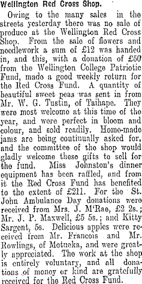 Wellington Red Cross Shop. Owing to the many sales in the streets yesterday there was no sale of produce at the Wellington Red Cross Shop. From tho sale of flowers and needlework a sum of £12 was handed in, and this, with a donation of £50 from the Wellington College Patriotic Fund, mado a good weekly return for the Red Cross Fund. A quantity of beautiful sweet peas was sent in from Mr. W. G. Tustin, of Taihapo. They were most welcomo at this time of the year, and were perfect in bloom and colour, and sold readily. Home-mado jams aro being continually asked for, and the committee of tho shop would gladly welcome theso gifts to sell for the fund. Miss Johnston's dinner equipment has been raffled, and from it the Red Cross Fund has benefited to the extent of £211. For the St. John Ambulance Day donations wero received from Mrs. J. M'Jtae, £2 25.; Mr. J. P. Maxwell, £5 55.; and Kitty Sargont, ss. Delicious apples were received from Mr. Francois and Mr. Rowlings, of Motueka, and were greatly appreciated. Tho work at the shop is entirely voluntary, and all donations ,of monoy or kind are gratefully received for the Red Cross Fund.