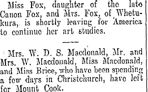Miss Fox, daughter of tho late Canon Fox, and Mrs. Fox, kura, is shortly leaving _ for America to continue her art studies. 1 Mrs. W. D. S. Macdonald, Mr. and Mrs. W. Macdonald, Miss Macdonald, and Miss Brice, who have been spending a few days in Christchurch, have left for Mount Cook.