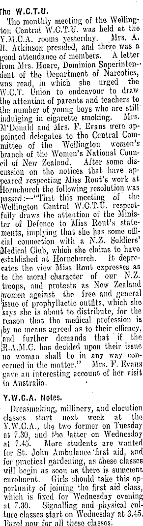 The W.C.T.U. Tho monthly meeting of tho AVelling'tou Central W.C.T.U. was held at the Y.M.C.A. rooms yesterday. Mrs. A. 11. Atkinson presided, and there was a good attendance of members. A letter from Mrs. Hoare, Dominion Superintendent of the Department of Narcotics, was read, in which she urged the IW.C.T. Union to endeavour to draw 'the attention of parents and teachers to the number of young boys who are still" indulging in cigarette smoking. Mrs. M'Donalcl and Mrs. V. Evans wero appointed delegates to the Central Com.mittee of tho Wellington women's branch of tho Women's National Council of New Zealand. After some discussion on tho notices that have appeared respecting Miss Rout's work at Hornchurcli the following resolution was massed:—"That this meeting of the •Wellington Central W.C.T.U. respectfully draws the attention of the Minister of Defence to Miss Rout's statements, implying that she has somo official connection with a N.Z. Soldiers' Medical Club, which she claims to have established at Hornchurcli. It deprecates the view Miss Rout expresses as to the moral character of our N.Z. troops, and protests as New Zealand nvomen against tho free and general ! issuo of prophyllactic outfits, which she says she is about to distribute, for the | reason that tho medical profession is iby no means agreed as to their efficacy, Innd further demands that if the IJR.A.M.C. has decided upon their issue no woman shall bo in any way concerned in the matter." Mrs. ¥. Evans gave an interesting account of her visit i to Australia. i Y.W.G.A. Notes. ,' .Dressmaking, millinery, and elocution : classes start next week at the ' Y.W.C.A., the two former on Tuesday at 7.30, and t-'io latter on Wednesday iat 7.45. More students are wanted i for St. John Ambulance "first aid, and • for practical gardening, as these classes i will begin as soon as. there is sumctent • enrolment. Girls should take this opportunity of joining the first aid class, which is fixed for Wednesday evening at 7.30. Signalling and physical culture classes start on Wednesday at 3.45. . Enrol now for all these classes'.