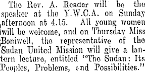 Tlio llev. A. Reader will be tliu speaker at Die Y.W.C.A. on Sunday laftemoou at 4.15. All young women iwill be welcome, and on Thursday Miss jßonhrell, the representative of tlio Sudan United Mission will give a lantorn lecturo, entitled "The Sudan: Its Peoples, Problems, tnd Possibilities."