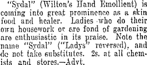 "Stydal" (Wilton's Hand Emollient) is coining into great prominence as a skin food and healer. Ladies who do their own housework or tiro fond of gardening aro enthusiastic in its praiso. Note the name "Sydal" ("Ladys reversed)., and do not take substitutes. 2s. at all chemists and stores.—Advt.