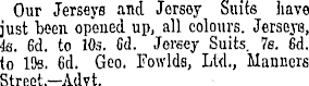 Our Jerseys and Jersey Suits have just been opened up, all colours. Jerseys, 4s. 6d. to 10s. fid. Jersey Suits. 7s. 6d. to 19s. 6d. Geo. Fowlds, Ltd., Manners Street.—Advt.