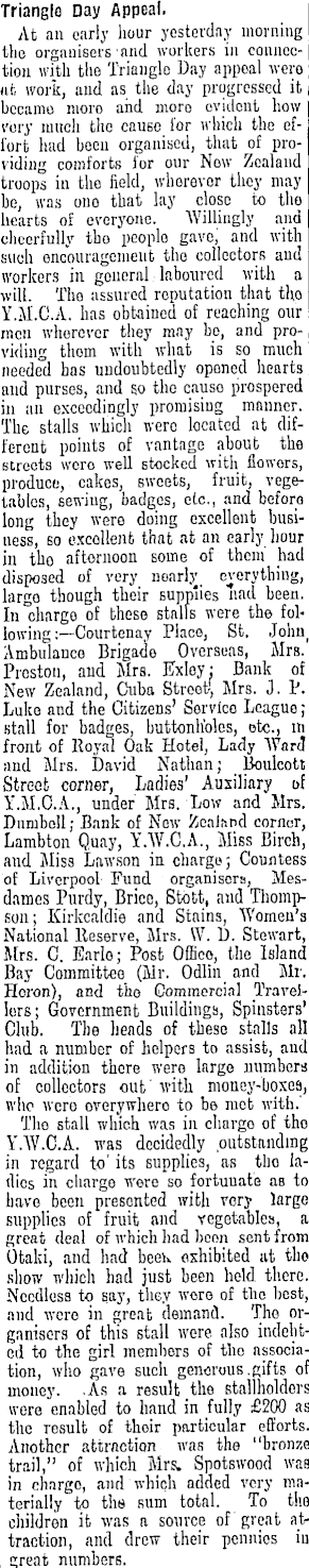 Triangle Day Appeal. At an early hour yesterday morning the organisers and workers in connection with the Triangle Day appeal wero at, work, and as the day progressed it became moro and more evident how very much the cause lor which the effort had been organised, that of providing comforts for our Now Zealand troops in the field, wherever they may he, was ono that lay close to tho hearts of everyone. Willingly and cheerfully tho people gavei and with such encouragement tho collectors and workers in goiieral.-laboured with a will. Tho assured reputation that tho Y.M.C.A. has obtained of reaching our men wherever they may ho, and providing thorn with what is so much needed has undoubtedly opened hearts and purses, and so tho causo prospered in an exceedingly promising manner. The stalls which wero located at different points of vantage about the streets wero well stocked with flowors, produce, cakes, sweets, fruit, vegetables, sewiug, badges, etc., and before long they were doing excellent business, so excellent that at an early hour in tho afternoon some of them had disposed of very nearl.v everything, largo though their supplies nad been. In chargo of these stalls were the following :—Courtenay Place, St. John, Ambulance Brigade Overseas, Mrs. Preston, and Mrs. Exloy; Bank of New Zealand, Cuba Street, Mrs. J. P. Luke and the Citizens' Service League; stall for badges, buttonholes, etc., m front of Royal Oak Hotel, Lady Ward and Mrs. David Nathan; Boulcott Street corner, Ladies' Auxiliary of Y.M.C.A., under Mrs. Low and Mrs. Dumboll; Bank of Now Zealand corner, Lambton Quay, Y.W.C.A., Miss Birch, and Miss Lawson in charge; Countess of Liverpool Fund organisers, Mesdames Purdy, Brice, Stout, and Thompson; Kirkcaldie and Stains, Women's National Reserve, Mrs. W. D. Stewart, Mrs. C. Earlo; Post Office, the Island Bay Committee (Mr. Odlin and Mr. Horon), and tho Commercial Travellers ; Government Buildings, Spinsters' | Club. The heads of these stalls all had a number of helpers to assist, and in addition there wero largo numbers of collectors out' with monoy-uoxea, who wero overywhero to be mot with.' The stall which was in chargo of tho Y.W.C.A. was decidedly outstanding in regard to' its supplies, as tho ladies in charge were so fortunate aB to have been presented with very large supplies of fruit and vegetables, a great deal of which had boon sent from Otaki, and had beeu exhibited at tho show which had just been held, there. Needless to s.ay, they wore of the best, and were in great demand. The organisers of this stall were also indebted to the girl members of the association, who gave such generous.gifts of money. .As a result the stallholders were enabled to hand in fully £200 as the result of thoir particular efforts. Another attraction was the "bronze trail," of which Mrs. Spotswood was in charge, and which added very materially to the sum total. To the children it was a source of great attraction, and drew their pennies in great numbers.