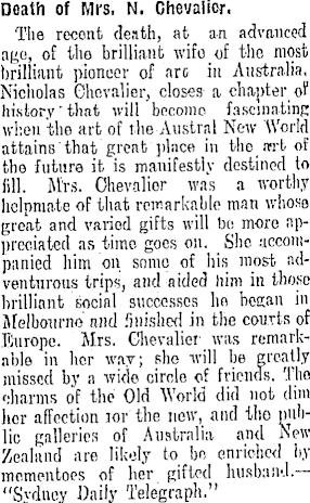 Death of Mrs, N. Chevalier. The recent death, at an advanced age, of tho brilliant wife of the most brilliant pioneer of arc in Australia, Nicholas Chevalier, closes a chapter of history" that will become fascinating when the art of the Austral New World attains that great place in the art of the future it is manifestly destined to (ill. Mrs. Chevalier was a worthy helpmate of that remarkable man whose great and varied gifts will be more appreciated as time, goes on. She. accompanied him on some of his most adventurous trips, and aided him in those brilliant social successes he bcaan in Melbourne and finished in the courts of Europe. Mrs. Chevalier was remarkable in her way; she will be greatly missed by a wide circle of friends. The '.•harms of the Old World did not dim her affection ior the new, and tho public galleries of Australia and New Zealand are likely to bo enriched by mementoes of her gifted husband — "Sydney Daily Telegraph."