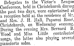 Delegates to the Victora League Conference, held in Christchurch during tho past two days, wero entertained at a reception held at tho residence of Mr. and Mrs/ J. H. Hall. Papanui Road, Christchurch, on Wednesday evening. During tho evening Mrs. Bernard B. Wood and Miss Little contributed songs, tho latter also playing several pianoforte solos. .