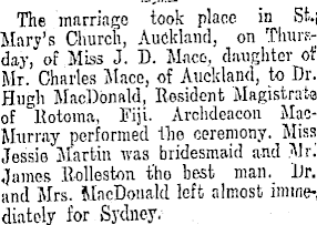The marriage took place in St., Mary's Church, Auckland, on Thursday, of Miss J. D. Mace, daughter of Mr. Charles Mace, of Auckland, to Dr. Hugh MacDbnald, Resident Magistrate of llotoina, Fiji- Archdeacon MacMurray performed the ceremony. Miss Jessie Martin was bridesmaid and .Mr.' James llolleston t'ho best man. Dr.. and Mrs. Mac Donald left almost imtne-, diatoly for Sydney.