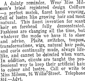 A dainty- reminder. Wear Miss Milsom's latest registered design Coilhtre —a perfect match, finest hand weaving, full of lustre like growing hair and most natural. This finest invention for scant hair on forehead fully demonstraled. Fashions aro changing all the time, but whatever the mode wo have it to show and advise. Plaits,, switches, toupees, transformations, wigs, natural hair pads, and carls continually made, always lifelike and cannot be detected when worn, In addition, clients are taught the professional way to keep their artificial hah to colour and lustre. Call or write to Miss Milsom, 91 Willis-Street. Telephone BU—Advt.