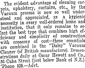 The evident advantage of cleaning carpets, upholstery, curtains, etc.. by the Vacuum process is now so well understood and appreciated, as a hygienic necessity in every well-ordered home and institution, that it only remains to select the best type that combines high efficiency and simplicity of construction with economy of cost—these' essentials uro combined in the "Daisy" Vacuum Cleaner (of British manufacture). Demonstrations daily at Oscar Ilewett and Co, 5S Cuba Street Oust below Bank of N.Z.). 'Phono 520-Advt.
