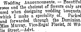 Wedding Announcements. — Beaut) Tul roses and the ohoioeßt of flowers only are used when designing wedding bouquets, which I make a speciality of. Packed and forwarded through the Dominion. Miss Murray, Vice-Regal Florist, Sfi Willis Street.—Advt.