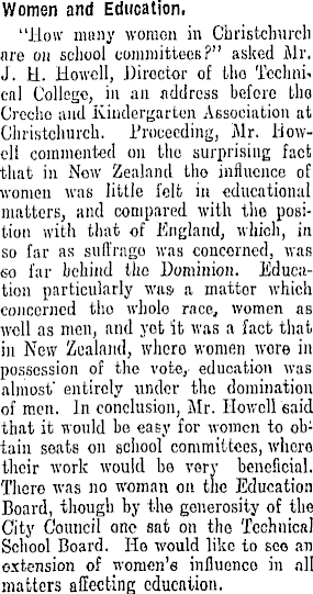 Women and Education. "How many women in Christchurch are on school committees?" asked Mr. J. H. Howell, Director of tho Tecum, cal College, in an address before tho Creche and Kindergarten Association at Christchurch. Proceeding, Mr. Howell commented on the surprising fact that in Now Zealand tho influence of women was little felfc in educational matters, and compared with the position with that of England, which, in so far as suffrage was concerned, was 60 far behind the Dominion. Education particularly was a mattor which concerned tho whole race, women as well as men, and yot it was a fact that in New Zealand, where women wore in possession of the vote,- education was almost' entirely under the domination of men. In conclusion, Mr. Howell 6aid that it would be easy for women to ob : tain seats on school committees, where their work would he very beneficial. There was no woman on the Education Board, though by the generosity of the City Council one sat on tho Technical School Board. Ho would like to see an extension of women's influenco in all matters affecting education.