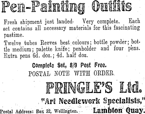 Pen-Painting Outfits Fresli shipment just landed- Very complete. Each set contains all necessary materials for this fascinating pastime. Twelve tubes Reeves best; colours; bottle powder; bottle medium; palette knife; penholder and four pens. Extra pens 6d. doz.; 4d. half doz. Complete Set, 8/9 Post Free. POSTAL NOTE WITH ORDER. PMNGLE'S Ltd. , I'Art Needlework Specialists," P.ostal Address: Box 32, Wellington..-■ LaiUDfoli Qliay.