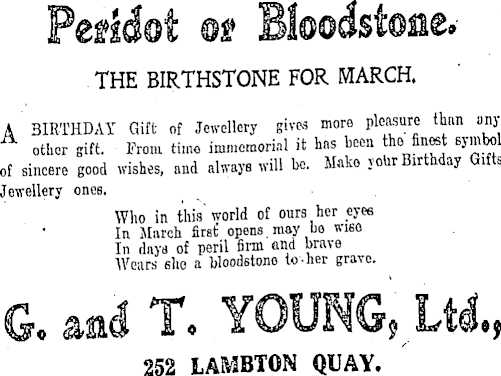 Peridot ®$ Bloodstoae. THE BIRTHSTONE FOR MARCH. A BIRTHDAY Gift of Jewellery gives mora pleasure than any A other gift. From time immemorial it hns been the finest symbol of sincere good wishes, and always will be. Make your Birthday Gifts Jowellery ones. Who in this'world of ours her eyes In March first' opens.may be wiso In dnya of peril firm and brave Wears she a bloodstone to.her grave. G. mi T. YOUNGI Ltd., 252 LAMBTON QUAY.