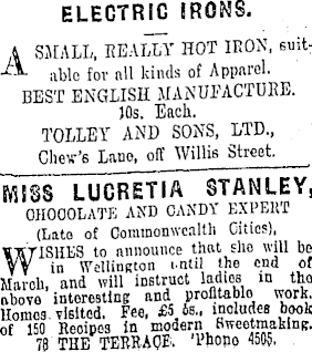 ELECTRIC IRONS. 4 SMALL, REALLY HOT IRON, suit; ■£*■ able for nil kinds of Apparel. BEST ENGLISH MANUFACTURE. JOs. Each. TOLLBY AND SONS, LTD., Chew's Lane, off Willis Street. MISS LUCRETIA STANLEY, CHOCOLATE AND CANDY EXPEKT (Lato of Commonwealth Cities), W' ISIIES to announce that she will be in Wellington i-ntil the end of Maroh, and will instruct ladies in the nboYO interesting and profitable; work. Homos, visited. Fee, £5i is., moludes book of 150 Keoipos in modern Hweetmaking. 70 THE TERRACE, "l'hopo 4505,