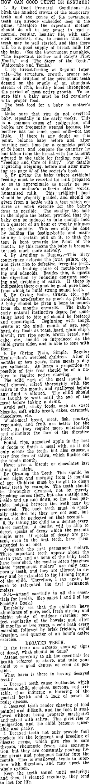 HOW CAN GOOD TEETH BE ENSURED? 1. By Good Pre-natal Conditions— At birth the huiehed crowns of the temporary teeth and the germs of the permanent teeth are already embedded deep in the gums; ithereforo tho expectant mother should do all in her power to lead a normal, regular, healtiiy life, witb sufficient exercise, etc., to enbure that the teeth may be lvell started, and that there will be a good supply of breast niilli for the baby. (See the Government pamphlet, "The Expectaut Mother and Baby's First Month," and "The Story of tho Teeth," Whitaombe and Tombs.) 2. By Breast-feeding; at Regular Inter vals.—The structure, growth, proper settine, and eruption of the permanent teeth depend on the srpply of an abundant Btream of rich, healthy blood throughout the period of most active growth. To ensuro this a baby niust be fed regularly with proper food. Tho best food for a baby is mother's milk. Make sure that you do not overfeed baby, especially in the early weeks. This is a common cause of indigestion, and babies are frequently weaned because the mother has too much good milk—not too little. If there is any doubt on this point, balance baby !>efore and after nursing each time lor a complete period of 24 hour 6, and compare the quantity he has taken from the brea6t with the amount advised in the table for feeding, page M, "Feeding and Caro of Baby.'' For details regarding weighing, before and after nursing Bee page 57 of the society's book. 3. By giving the baby (where artificial feeding must be resorted toi milk prepared so. as to approximate as nearly a 6 possible to mother's milk —in other words, humanised milk. This artiflicial food should be properly graded, and should be given from a bottle ,\ith a teat which ensures as much exercise for tho baby's jaws as possible. Tho smaller the hole in the nipple the better, provided that the baby can be induced to take enough food in a quarter of an hour or twenty minutes at the outside. This can ouly be done by holding the feeding-bottle and maintaining a certain pull on it, so that the teat is kept towards the front of tho mouth. By thiß means tho baby is brought to suck much more aotively. 4. By Avoiding a Duinmy.-This dirty contrivance deforms the jawe, palate, etc.. and gives rise to defective, irregular teeth, and is a leading cause of mouth-breath-. Ing and adenoids. Besides this, it upsets the digestion t-y inducing constant sucking and dribbling of saliva. If there is indigestion there cannot be good, pure blood from which to build strong sound teeth. 5. By Giving Bones, Crusts, etc., and avoiding pap-feeding as much .as possible. A baby should be given a bono to munch from six inonthß onwards. The baby's early natural instinctive desire for somethiijg hard to bite at should be fostered and encouraged. Beginning with tough, crusts at the ninth month of age, such hard, dry foods as toaßt, hard, plain ship s biscuit, raw rips opplc, brown bread, and cake, etc.. should be introduced as the ohild grows older, and is able to cope with them. „. , , 6. By Giving Plajn,. Simple, Regular Meals.-Don't overfeed children. After 18 months or two years, three meals a day are sufficient. As large a proportion as possiblo of this frod should bo of a nature to require active chewing. The solid part of the meal should be well chewed, mTxed thoroughly with the saliva in the mouth, and swallowed before any fluid is allowed. The child should bo taught to wait until the end of the meal before taking a drink. Vvoid soft, sticky foods, such, as sweet biscuits, soft white bread, cakes, caramels, chocolates, etc. , , ~ Wkolc-meal bread, moat, fish, poultry, vegetables, and fruit are better for the teeth, o.b they require more mastication and stimulate the flow of the' digestive Jl ßound, ripo, uncooked apple is the best of foods to finish a meal with, as it not only cleans the teeth, but alsoi causes; a very free flow of saliva, which flushes out the whole mouth.. . Never give a biscuit or chocolates last thing at night. . . By Cleaning the Tceth.-This should bo : done night find morning from 18 months of age. Children must bo taught to clean their teeth by example. The teeth should bo thoroughly cleansed, not by merely brushing across them, but also outsirle anU insido and up and down, so that food particles lodging between tho tenth, may be/ amoved. The back teeth must bo specially attended to; they are not scon, but must, not bo neglected on that account. 8. By ta.kingJbo child to a dentist every three months. A dentist will bo able to detent speckß of decay which the parents might miss. If specks of decay are present, even in tho first teeth, havo them attended to at. once. ' KifCßuard tho first permanent molars. Theso important teeth appear about the sixth year, and bb none of the baby teeth have been'shed, the mother .often imagines these "permanent, molars arc only ternporary teeth, and they are allowed to doJav and be extracted to the lifelong injury of the child. Therefore, 1 say again, bo sure to safeguard the first permanent carefully to all the essentials for health. (Seo pageß 1 and 2 of the Society's Book.) , . Especially see that the children have abundance of pure, cool, fresh air day and night; plenty of outdoor exercise; per-, feet regularity of the boweta: and, after 16 months or two years, a cold bath every morning', followed by brisk friction, rapid dressing, and quarter of an hours active CXCrCU °-' DECAYED TEETH. . . If the teem uru uireudy showing signs of decay, what should bo done? Attend carefully to all tho essentials for health referred to above, and take your child to a good deutist ae soon as possible. ... , , What harm is there in having decayed 1 Decayed teeth cause toothache, w£jch makes a child sleepless, nervous, aud irritable, thus inducing a lowering ot the general health and a lack of power to rc6ißt disease. . ■ , 2 Decayed teeth render chewing of food painful and difficult, and the food is swallowed w
