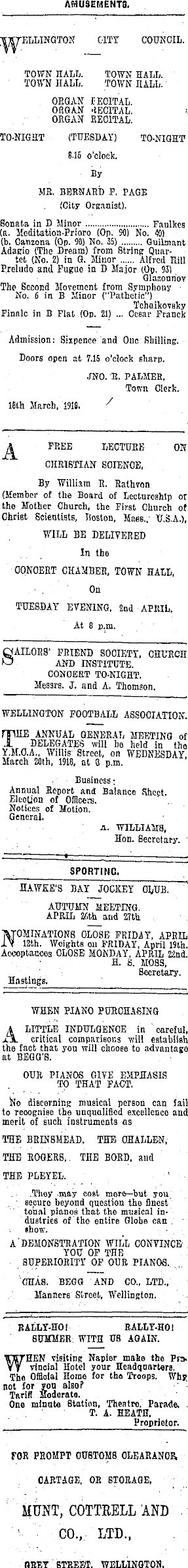 AMUSEMENTS. C-ITY COUNCIL. TOWN HALL. TOWN HALL. TOWN HALL. TOWN HALL. . ORGAN JPEOITAL. ORGAN ■iECITAL. ORGAN RECITAL. TO-NIGHT (TUESDAY) TO-NIGHT 8.16 o'clock. By ME. BERNARD F. PAGE (City Organist). Sonata in D Minor Faulkcs (a. Mcditation-Prioro (Op. 90) No. 40) (b. Canzona (Op. 90) No. 35) Guilmant Adagio (The Dream) from String Quartet (No. 2) in G. Minor Alfred Hill Preludo and Fugue in D Major (Ob. 93) Glazouriov Ths Second Movement from Symphony No. 6 in B Minor ("Pathetic") Tchaikovsky Finale in B Flat (Op. 21) ... Ccßar Franck Admission: Sixpence and One Shilling. Doors open at 7.15 o'clock sharp. JNO. 'E. PALMER, Town Clerk. 18th March, 1918. / FEEE LECTUEE ON CHRISTIAN SCIENCE, By William R. Rathvon (Member of the Board of Lectureship or the Mother Church, the First Church of Christ Scientists, Hoston, Maes..- U.S.A.), WILL BE DELIVERED In the CONCERT CHAMBER, TOWN HALL, On TUESDAY EVENING, 2nd APRIL, At 6 p.m. SAILORS' FRIEND SOCIETY, CHURCH AND INSTITUTE. OONOEET TO-NIGHT. Messrs. J. and A. Thomson. WELLINGTON FOOTBALL ASSOCIATION. The annual general meeting of DELEGATES will be held in tho Y.M.0.A., Willis 1 Street, on WEDNESDAY' March 20th, 1918, at 8 p.m. Business: Annual Report and Balance Sheet. Eleotion of Officers. Notices of Motion. General. A. WILLIAMS, Hon. Secretary. ' , ■ SPORTIHC, HAWKE'S BAY JOCKEY OljUli. AUTUMN MEETING. APRIL 2fith and 27th. Nominations close Friday, april 12th. Weights ou FRIDAY, April 19th. Acceptances OLOSE MONDAY, APRIL 22nd. H. S. MOSS, Secretary. Hastings. WHEN PIANO PURCHASING A LITTLE INDULGENCE in careful, A critical comparisons -will establish the fact that you will choose to advantage at BEGG'S. OUR PIANOS GIVE EMPHASIS TO THAT FACT. too discerning musical peTßon can fail to reoognisc the unqualified excellence and merit of such instruments as THE ERINSMEAD, THE OHALLEN, THE ROGERS,. THE BORD, and THE PLEYEL. 1 ■ ... .They may cost more—but you secure beyond question tho finest tonal pianos that the musical industries of tho entire Globe can . show. A DEMONSTRATION WILL CONVINCE YOU OF THE SUPERIORITY OF OUR PIANOS. OHAS. BEGG AND CO., LTD., Manners Street, Wellington. RALLY-HO! RALLY-HOI SUMMER: WITH US AGAIN. WHEN visiting Napier make the Pre. vinoial Hotel your Headqnarters, Tho Offlolal Home for tha Troops. Why. not for you also? TarilT Moderate. Ona minute Station, Theatre, Parade, . T. A. HEATH. Proprietor. FOR PROMPT CUSTOMS OLEARANOR CAETAGE, OE STORAGE, MMT, COTTRELL AND v CO., LTD., i OBEY STREET. WELLINGTON.