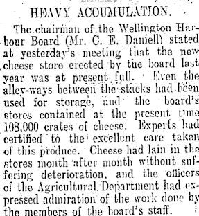 . HEAVY ACCUMULATION. ' The chairman of .the Wellington Harbour Board (Mr. C. E. Daniell) stated at yesterdayV meeting that the new .cheese store erected by the hoard last year was at present, full. 1 Even the alley-ways between the'-stacks hadbcen used for storage, and' the hoard's stores contained at the present, time 108,000 crates of cheese; Experts luid certified to the 1 excellent care taken of this produce. Cheese had lain in tho stores month 'after month without suffering deterioration, and the 'officers of the Agricultural' Department Itad expressed admiration of the work done by tho members of the board's staff.