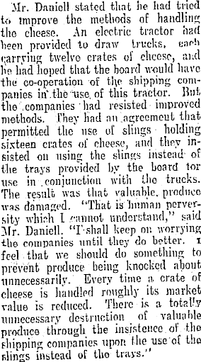 'Mr. Daniell stated that he had tried t<i improve the methods of handling the cheese. An electric tractor had been provided to draw trucks, each carrying twelve crates of cheese, and lie had hoped that the board would have the co-operation of il\c shipping companies in'.tlie tise, of this tractor, lint, the .companies had resisted improved methods. They had an agreement that permitted the use of slings ■ holding sixteen crates ol' cheese, and they insisted 011 using the slings instead- of the trays provided by the board tor use in'.conjunction with the trucks. The result was that valuable., produco was damaged. "That is 'lmnian perversity which I .cannot understand," said Mr. Daniell. "I"'shall keep or. worrying the companies nntil they do better, x feel that we should do something to prevent produce being knocked about unnecessarily. Every time a. crate of cheese is handled roughly _ its market value is reduced. There is a totally unnecessary destruction of valuable-, produce through the insistence of tho shipping companies upon the use of the filings instead of tlio trays."