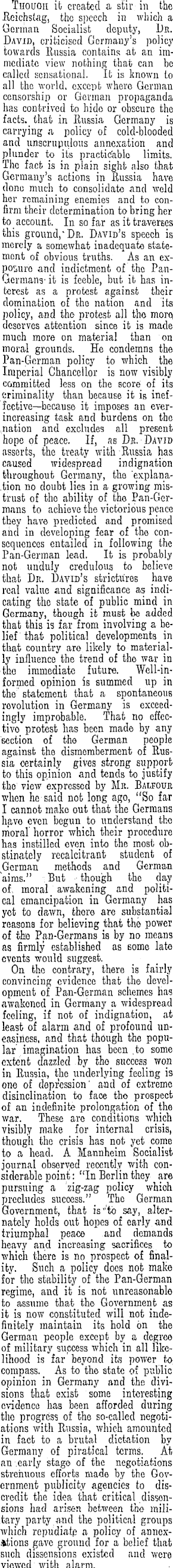 Tuouoii it created a stir in the Reichstag, tho speech in which a German Socialist deputy, Dr. David, criticised Germany's policy towards Russia contains at an immediate view nothing that can bo called sensational. It is known to all the world, except where German censorship or German propaganda has contrived to hido or obscure the facts, that in Russia Germany is carrying a policy of cold-blooded and unscrupulous annexation and plunder to its practicable limits. Tho fact is in plain sight also that Germany's actions in Russia have done much to consolidate and weld , her remaining enemies and to con- [ firm their determination to bring her to account. In so far as it traverses this ground, - Dr. David's speech is merely a somewhat inadequate statement of obvious truths. As an exposure and indictment of the PanGermana' it is feeble, but it has inf terest as a protest against their domination of the nation and its policy, and the protest all tho more, deserves attention since it is made much more on material than on moral grounds. He condemns the Pan-German policy to which the ! Imperial Chancellor is now visibly committed less on the score of its criminality than because it is ineffective— because it imposes an everincreasing task and burdens on the fnation and excludes all present hope of peace. If, as Dr. David asserts, the treaty with Russia has < caused widespread indignation throughout Germany, the 'explanation no doubt lies in a growing mistrust of tho ability of the Pan-Ger-mans to achieve the victorious peace they have predicted and promised and in developing fear of tho consequences entailed in following the Pan-German lead. It is probably not unduly credulous to believe that Dr. David's strictures have real value and significance as indicating tho state of public mind in Germany, though it must be added that this is far from involving a belief that political developments _in that country are likely to materially influence the trend of tho war in tho immediate future. Well-in-formed opinion is summed up in the statement that a spontaneous revolution in Germany is exceedingly improbable. That no effectivo protest has been made by any section of the German people against the dismemberment of Russia certainly gives strong support to this opinion and tends to justify the view expressed by Mr. Balfour when he said not long ago, "So far I cannot make out that the Germans have even begun to understand the moral horror which their procedure has instilled even into the most obstinately recalcitrant student of methods and German aims." But though the day of, moral awakening and political emancipation in Germany has yet to dawn, thore are substantial reasona for believing that the power of the Pan-Germans is by no means as firmly established as some lato events would suggest. On the contrary, there is fairly convincing evidence that the development of Pan-German schemes has awakened in Germany a widespread feeling, if not of indignation, at least of alarm and of profound uneasiness, and that though tho popular imagination has been .to some extent dazzled by tho success won in Russia, the underlying feeling is one of depression' and of extreme disinclination to face tho prospect of an indefinite prolongation of the war. These are conditions which visibly make for internal crisis, though the crisis has not yet come to a head. A Mannheim Socialist journal observed recently with considerable point: "In Berlin they are pursuing a zig-zag policy whioh precludes success." _ The German Government, that is "to say, alternately holds out hopes of early and triumphal peace and demands heavy and increasing sacrifices to which there is no prospect of finality. Such a policy does not make for tho stability of the Pan-German regime, and it is not unreasonable to assume that tho Government as it is now constituted will not indefinitely maintain its hold on the German people except by a decree of military success which in all likelihood is far beyond its power to compass. As to the state of public opinion in Germany and the divisions that exist some interesting evidence has been afforded during the progress of the so-called negotiations with Russia, which amounted in fact to a brutal dictation by Germany of piratical terms. At an early stage of the negotiations strenuous efforts made by the Government publicity agencies to discredit the idea that critical dissensions had arisen between the military party and the political groups which repudiatp a policy of annexations gave ground for a belief that such dissensions existed and were viewed with alarm.