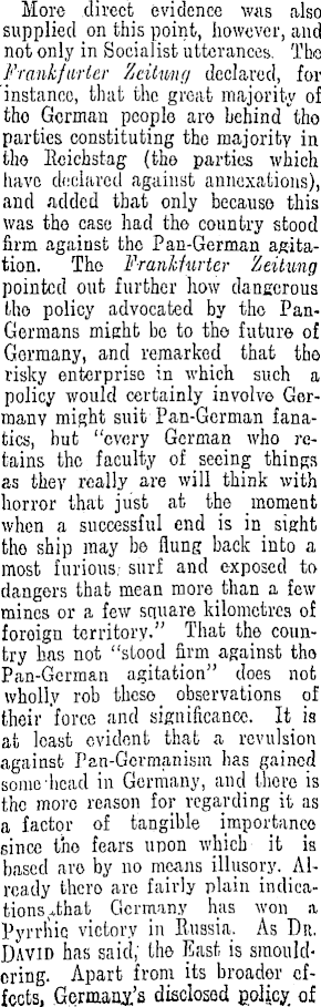 More direct evidence was also supplied on this point, however, and not only in Socialist utterances. The Frankfurter Zeilwiy declared, for j instance, that the great majority of tho German people are behind "the parties constituting tho majority in the Reichstag (the parties which have declared against annexations), and added that only because this was the case had the country stood firm against the Pan-German agitation. The Frankfurter Zeitung .pointed out further how dangerous tho policy advocated by tho PanGermans might be to tho future of Germany, and remarked that the risky enterprise in which, such a policy would certainly involve Germany might suit Pan-German fanatics, hut "every German who retains the faculty of seeing things as they really are will think with horror that just at the moment when a successful end is in sight the ship may be flung back into a most furious; surf and exposed to dangers that mean more than a few mines or a few square kilometres of foroign territory." That the country has not "stood firm against the Pan-German agitation" does not wholly rob these observations of their force and significance. It is at least evident that a revulsion j against Pap-Germanism has gained some head in Germany, and there is tho more reason for regarding it as a factor of tangible importance since the fears upon which it is based are by no means illusory. Already thero are fairly plain indications (♦that Germany has won a Pyrrhic victory in Russia. As Dit. David has said; the East is smouldering. Apart from its broader effects, Germany's disclosed fiolioy. of