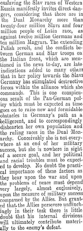 enslaving the Slav races of Western Russia manifestly invites direct dangers, considering that there are in the- Dual Monarchy more than twenty-four million Slavs and four million people of Latin race, as against twelve million Germans and ten million Magyars. The extending Polish revolt, and tho conflicts between German and Slav troops on .the Italian front, which are mentioned in tho news to-day, are lato indications added to many others that in her policy towards tho Slavs Germany has stimulated destructive forces within the alliance which she commands. This is one conspicuous result of the Pan-German policy which must be expected as timo goes on to raise new and formidable obstacles in Germany's path as a belligerent, and to correspondingly dishearten her own population and tho ruling races in the Dual 'Monarchy. Conceivably sho is not everywhere at an end of her military success, but sho is nowhere in sight of a secure goal, and her political and racial troubles must be expected to develop. No doubt the practical importance of these factors as they bear upon tho war and upon the problems of neace must depend very largely, almost exclusively, upon tho measure of military success compassed by the Allies. But granted that, the Allies persevere unflinchingly in their- task there is little doubt that his internal divisions will ultimately contribute materially to the enemy's defeat.