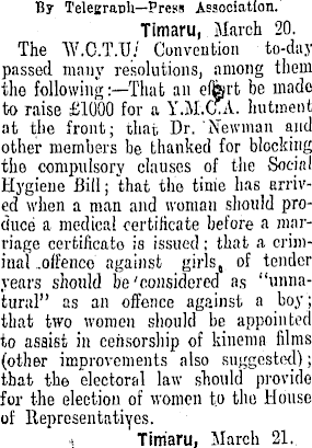 By Teleßrauh—Press Association." Tlmaru, March 20. The W.C.T.TJ: Convention to-day passed many resolutions, among them the following:—That an effort be uiado to raise £1000 for a Y.M.CTA. hutment at the front; that Dr. Newman and other members be thanked for blocking the compulsory clauses of the Social Hygiene Bill; that the tinie has arrived when a man and woman should produce a medical certificate before a marriage certificate is issued; that a criminal .offeneo against girls, of tender years should be'considered as "unnatural" as an offence against a boy; that two women should be appointed to asaist in censorship of kinemn films (other improvements also suggested); that the electoral law should provide for the election of women to the House of RepresentatiYes. t Tiniaru, March 21.