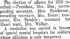 The election o. f officers for 1918 re-sulted-.—President, Mrs. Don; corresponding secretary, Miss Henderson-, recording secretary, Mrs. Evans; treasurer, Mrs. Bendely; treasurer for Maori work, Mrs. Walker. A resolution was carried iu favour of special mental hospitals for soldiers whose affliction is only temporary.