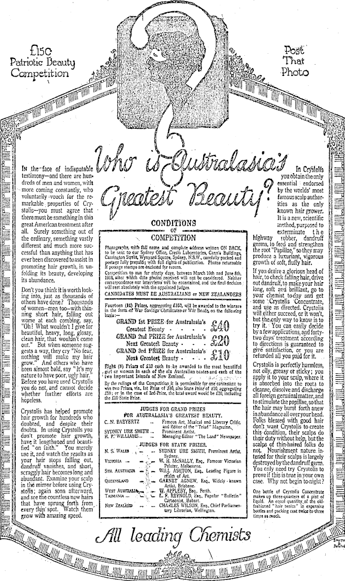 p| testimony—and there are hun- I J _ you obtain tho only ggj dreds of men and women, with £$ essen, ' a l endorsed j •—^ s - more coming constantly, who J- / ■/> YJ i( by the worlds' most HI B_ voluntarily-vouch for the re- (! t OAI fl"j fffl) I// J/ • famous scalp author- 1-3 jal marltable, properties of Cry- I (f ities as the only i g stolis—you must agree that ' f/ / known ; J = there must be something In thi3 V. It is a new, scientific j H=3 jjp' greatAmerlcantreatmentafter CONDITIONS method,purpos:d to j 1= all. Surely something out of of _.exterminate the j=j the ordinary, something vastly \ COMPETITION highway robber, dandruff j §gp k different and much more sue Photographs, with fldl name and compete address written ON BACK, id! S= cessfulthan anything that has to be wnt to our Sydney Office, Credo LaborotorlcJ, Cann's Buildings, Izl * SOincyiT.dy , — r PVprhppnriiQrnvprprtfna««i<stm CarripgWn Sottt, V/ynyard Square, Sydney, NS.W, carefully packed and product a luxuriant, VlgoroUß ;—r L. e\ er oeen aiscoverea mssm m ttje rully full of p h otos returnable growth of soft, fluffy hair. ! promoting hair growth, in un- if pwXasestßapa are dndosfedf&r return. , i« j f L — Cfoldintr its beauty, developing Competition to run for ninety days, between March 10th and June Bth, if yoil deßire a glonous head of —> itQ ahitn/JanrA 1918, after which ddto pholos received will not be considered. Neither hair, 10 check falling hair, drive i t== iia duunuduce. correspondence nor interviews' will bo entertained, and the Until decision out dandruff, to maK6 your hair S r Don'tyou think it is worth look- wilt f w. a b»!utely with the oppomttdiudjes. long, soft wa brilliant, BO to ~ ing into, just as thousands of CANDIDATES MUST EE AU3T3ALIAN3 or NEW ZEALANDEB3 your chemist to<say ana get .=j p= others have done? Thousands _rf „ ~ .... ... v • ■ some''.CrystoHs Concentrate, ~j y of women-men. too-withthin- M = nmg short hair, falling out bass:- will either succeed, or it wont, =3 i- each f?™ b H GBASD Ist mZE -for Australasia's QA(\ but the.only way to tai&w is to = Oh! What wouldn 11 give for flwniMf Smi. xixy try it.; You con easily decide ==! p beautiful, heavy. Ion?, glossy, !nl / by a few applications, and forty- I .== L cisan hair, that wouldn't come GRAND 2nd PRiZE for Australasia s /}«JA two'days treatment according i "S — out." But when someone sug- Nsst Greateift Beauty • - • ds&iv to directions is guaranteed to j ==j r- gests a way, they cry "No fear, GRAND 3rd PRIZE for Australasia's jp-SA' give satisfaction, or vou are j'== kr will make my hair Noxl.Greatest'Beauty • •. - Sill refunded all you paid for it. ~ I_J P ' mv »t») of iM wh to .tc m.rdcd to the no.t tatlful Crystolis ia perfectly harmless, (= <— Ds f l ainiosc Daia, say it s mjj # ffifl cr noman j n uc j, 0 f jj, e 6 j x Australian Matesona <ich of the not oily, greasy at sticky: you ] J zzz nature to have poor, ugly hair. 1 two important Wandi of New Zeainnd. • apply it to your scalp,Avhcre it ij —E p= Before you have used Crystolis By the ruling* <rf thr Competition,it is pcrtatsjibte for one'conregtar.t to is absorbed into the'root3 to li 1-Z= you do not, and cannot decide win two Priiea, vis, Ist Pn« of 5-HJ, also State Wry of £10, arerecuting cleanse diflsol ve and fiiorhafop i 1 —J p. | whether /urther efforts are gS n 3ma |= L_ hopeless. , to stimulate the papillae, so that | j = Crvstolis has helt>ed oromote JDDges for grand prizes theiiaii-may burst forth anew l== ,r hafrcrowthforhmid m aubtrausia'S greatest beauty. mabundancealloveryourhead. i== = doubted and despite their C - N - BAEYERTZ - Famous Art, Mutical and Literary Critic blessed With good hair j == s®"P{® a ',*™; 'and Editor of the "Triad" don.t Want CryStollS to create 1 = p doubts. In using Crystolis you smrcv iirs SMITH.. Prominent Artist. N this ciondltion, their scalps do = don t promote hair growth, h. p.'wiluams... - Managing-Editor "The Land" Newspaper. thsir duty without help but the .. —" P mSliu . judges FOR btate prizes. scalps of thin-haired folks do j== —, M!r; Lv,i.!, N. s. Wales , _ .. SYDNEY URE SMrra, Prominent Artiit not Nourishment nature, in- LJ m ! use It, and watch the results as ' . Sydn(!jr . teried for their scalps is largely = n== your hair stops falling out, Victoria .. - t -.<- W. H. McNALLY, Esq. Famous-Victorian desfrovedbvthodandmfffferm I — n dandruff vanishes, and short, . ?iimer. Melbourne. ??""■ 3 —' scracrly hair becomes lone and s™. Austratja -f;-. WILL Asi(ton, Esq, Leading Figure in You only need try Crystolis to | — = ?! rtalcti of Art. , prove if this is true in your own — \ abundant, uamme your scalp quehhsiaw) — «. GARNBT agnew. Esq, widely • kno**n caße. V/hy not begin to-night? I fi in the mirror before using Cry- •>!; Artist, Brisbane. . Bl==' S stolis; again soon afterward, West Aubtrsu^W.AHPLEBY. Em, Perth. One bottle of Crystolis Concentrate Is! 3 and see tne countless new hairs L.IP.REYNOLD, lisq., Popular "Bulletin" mako up three-quarters of a pint of j—; g that have sprjmg forth from . nctZhuSed 3 3 — every tlun spot. < Watch tnem laty Liorarian, Wellington. bottles and packing cost tvrice to-Ihret II = i grow with amazing speed. ' times airntidu LJ;