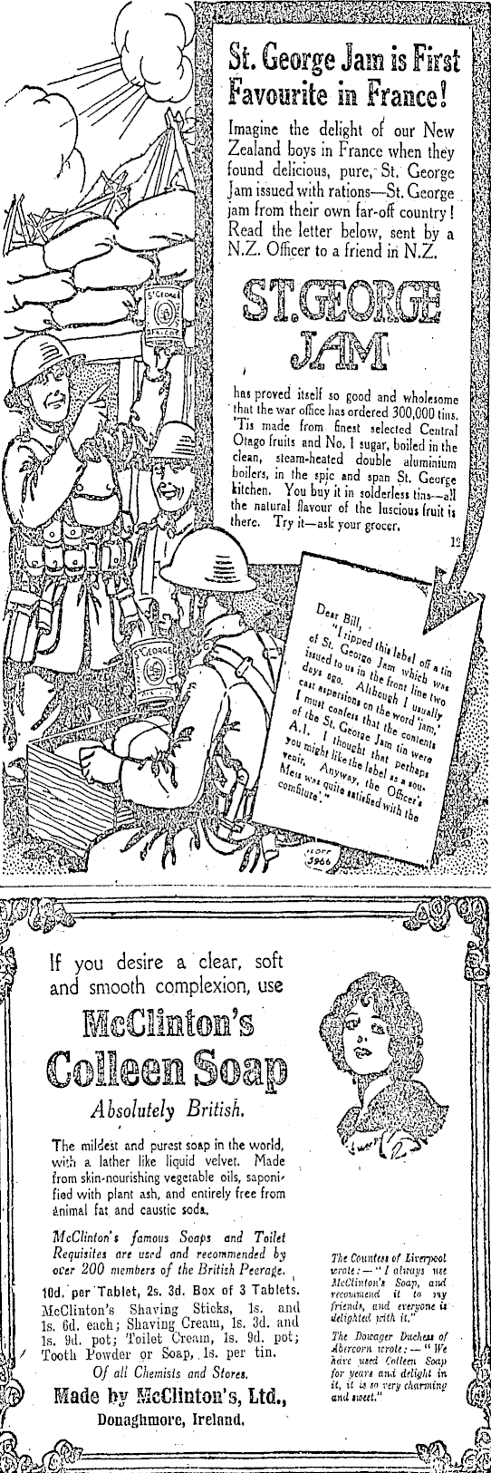 §*• George Jam is First | ' Favourite in France! f / ' ' mag ' nc l ' ie delight of 1 our New If J\ JnttkVm Zealand boys in France when they f s| P ) Aoy'/ found delicious, purer St. George '<$ U -l am ' 5SUe d with rations—St. George |fj . P jam from their own far-off country! If Read the letter below, sent by a i§ certoa^r ' en^'n li | 9 tago fruils and No ' l !ü ß ar ' if f iSWr l sleam-hcated double aluminium I ifflf / X |Mi- g§ °?"9 rs » in [^e spic and span St. George M «, I •'tchen. You buy it in solderless tins—all tgjfl na ' u r J, flavour of the luscious fruit it pji you desire a clear, soft |jjr and smooth complexion, use ]1 HeClimtoa's' Colleen Soap ' Absolutely British. The mildest and purest soap in the world, with a lather like liquid velvet. Made . , from skin-nourishing vegetable oils, saponi' fied with plant ash, and entirely free from ; inimal fat and caustic sodi. McClinion's famous Soaps end Toilet Requisites are use J and recommended hy The Cmmtm ef lirenml , oCtr 200 members of the British Peerage. wnlt: — "lalmp «« Air* po-tlij.' JUi'Cfintott'j Soap, and 10d. per Tablet, 2s. 3d. Box of 3 Tablets. muMiioKi i( to ny |j II McClinton's Shaving Sticks, Is. and fnmd\ mrycmU Is. 6d. each; Shaving Cream, Is. 3d. and Mighta. mtint. Is till, pot; Toilet Cream, Is. 9d. pot; The Domgtr JHehm of ■ ii > Tootli Powder or Soap,.ls. per tin. M stf Of all Chemists and Stores, for yean ana delight in fp> Made by McClinton's, Ltd., andiwut" ' ' I Donaghmore, Ireland.