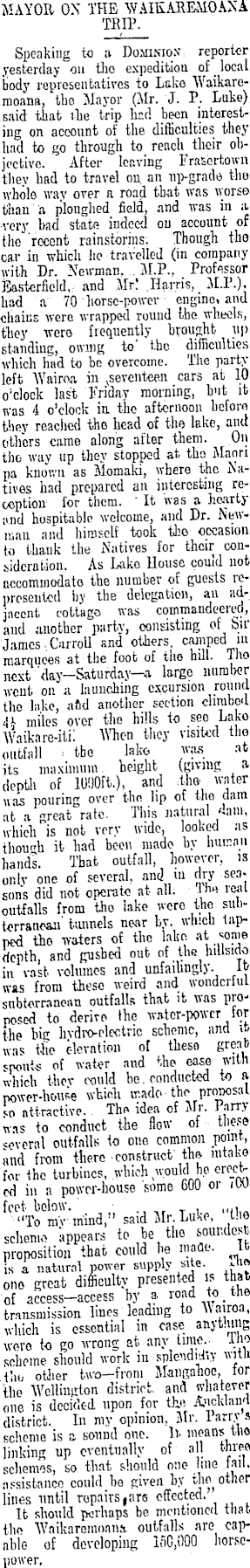 MAYOR OX THE WAIKAREMOANA TRIP. Speaking to a Dominion reporter yesterday 011 tlic expedition of _ local body representatives to Lake Waikaremoana, tbe Mayor (Mr. J. P. Luke) said that the trip lmd been interesting on account of the difficulties they had to go through to reach their objective. After leaving FraSertown they had to travel on an nip-grade the whole way over a road that was worse than a ploughed field, and was in a. very bad state indeed on account or the recent rainstorms; Though tho car in which ho travelled (in company with Dr. Newman, . M.P., Professor Basterfield, and Mr! Harris, M.I 1 .), had a 70" horse-power engine% and chains were wrapped round the wheels, tiiey were frequently brought up standing, owing to' t.hc difficulties which had to be overcome. The party left Wairoa in cars at 10 o'clock last Friday morning, but it was 4 o'clock in. the afternoon before they reached the head of tlto lake, ana others came along after them. On the way up they stopped at tho Maori pa known as Momaki, where the Natives had prepared an interesting reception for them. 'It was a hearty and hospitable welcome, and Dr. Newman and himself took tho occasion to thank the Natives for their consideration. As Lako House couid not accommodate the number of guests represented by the delegation, an adjacent cottage was commandeered, aud another party, oonsisting of Sir James- Carroll and others, camped m marquees at the foot of the hill. Tho next day—Saturday—*a large number went on a launching excursion round tho lake, afid another section climbed ,{ v miles over tho hills to Waikare-iti! When they visited tho outfall < tbo lako w;us at its maximum, height (giving a depth of IUOOft.), and Aha water was pouring over the lip of the dam at a great rate. This natural dam, which is not very wide, looked as though it had been made by hurcon hands. That outfall, however, is oniv one of several, and m "0' sensons did not operate at all. 1n« real outfalls from tho iake wcro the subterranean tunnels near by, which tapped tho waters of tho lake, at -jonie depth, and gushed out of the hillsido in vast volumes and unfailingly. It was from these weird and wonderful subterranean outfalls that it was proposed to derive the water-power for the big livdro-electric schemc, and it was the elevation of these great; snouts of water and the ease with which they could be. conducted to a power-house which lr.ado the proposal so attractive. The idea of Sir. Pj irr > was to conduct the flow of these several outfalls to one common point, and from there construct the intake for the turbines, .which would.Jh.e erected in a power-house some oOU or iuu feet bolow. ' , "To m'v mind," said the scheme 'appears to be the soundes proposition that could be mafle. L is a natural power supply site. *.Hb one great difficulty presented is that of access—access by a. road to _ the transmission lines leading to Wairoa, which is essential in case aajt.ung vero to go wrong at any time., llw scheme should work in splendidly witu t'lu other two —from Mangahoe, for the Wellington district, and whatever one is decided upon for the Auckland district. In my opinion, Mr. I arry s scheme is a sound one. It means the linking up eventually of all three schemes, so that should one line fail, a ssistanco could he given by other lines until repairs,are effected. It should perhaps be mentioned that the Waikaremoana. outfalls are capable of developing IflG,ooo horsepower,