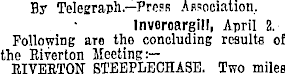 By Telegraph—Press Association. Inveroargill, April 2. Following are tho concluding results of the Riverton Meeting:— KIVERTON STEEPLECHASE. Two miles