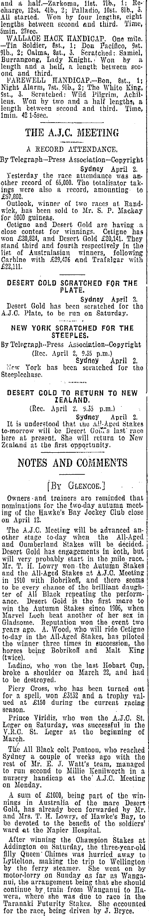 and A half.—Zarkoma, list. 71b., 1; Itechargo, 12st. 41b., 2; Palladio, lOst. 81b., 3. All started. Won by four lengths, eight lengths between second and third. Time, 6min. 27sco. WALLACE HACK HANDICAP. One mile. —Tin Soldier, Bst„ 1; Don Pacifico, 9st. 91b., 2; Calma, Get., 3. Scratched:. Samiel, Burrangong, Lady Knight.-' Won by a length and a half, a length between second and third. FAREWELL HANDICAP.—Bon, Bst.. 1; Night Alarm, 7sti. 91b., 2; The Wliito King, Sst., 3. Scratched: Wild Pilgrim, Achilleus. Won by two and a half lengthsi a length between second and third. Time, lmin. 421-ssec. THE A.J.C. MEETING A RECORD ATTENDANCE. By Telegraph—Press Association—Copyright Sydney April 2. Yesterday the race attendance was another record of 65,000. The totalisator takings were also a record, amounting- to £57,802. Outlook, winner of two races at Randwick, has been sold to Mr. S. P. Mackay for 5000 guineas. Cetigne and Desert Gold are having a close contest for winnings. Cetigne has won £20,824, and Desert Gold £20,141. They stand third and fourth respectively in tho list of Australasian winners, following Carbine with £29,476 and Trafalgar with £22,111. DESERT COLD SCRATCHED FOR THE PLATE. Sydnoy April 2. Desert Gold has been scratched for tho A.J.C. Plate, to be run on Saturday. NEW YORK SCRATCHED FOR THE STEEPLES. By Telugraph-Press Association-Copyright (Rec. April 2, 9.35 p.m.) Sydney April 2. Kew York has been scratched for the Steeplechase. DESERT COLD TO RETURN TO NEW ZEALAND. (Rec. April Z. 9.35 p.m.) Sydney April 2. It is understood that ilie AL'-Aged Stakes to-morrow will be Desert Goi"s last'race 1 here at present. She will return to New Zealand at the first opportunity. NOTES AND COMMENTS ! [By Glencoe.] Owners-and trainers are reminded that nominations for the two-day autumn meeting of the Hawke's Bay Jockey Club close on April 12. The A.J.C. Meeting will be advanced another stage to-day when the All-Aged and Cumberland Stakes will be decided. Desert Gold has engagements in both, but will very probably start in the mile race. Mr. T. 11. Lowry won-the Autumn Stakes and the All-Aged Stakes at A.J.C. Meeting in 1910 with Bobrikoll, and there seoms to be every ehunce of the brilliant daughter of All Black repeating tho performance. Desert Gold is tho first maro to win tho Autumn Stakes sinco 1906, when Marvel Loch beat another of her sex in Gladsome. Reputation won the event two years ago. A. Wood, who will rido Cetigno to-day in the All-Aged Stakes, has piloted tho winner three times in succession, tho horses being Bobrikol! and Malt King (twice). Ladino, who won the laßt Hobart Cup, broke a shoulder on March 22, and had to be destroyed. Fiery Cross, who has been turned out for a spell, won £3132 and a trophy valued at £150 during the current racing season. Prince Yiridis, who won the A.J.C. St. Leger on Saturday, was successful in the Y.R.C. St. Leger at tho beginning of March. The All Blaok colt Pontoon, who reached Sydney a couple of weeks ago with the rest of Mr. E. J. Watt's team, managed to run second to Millie Kenilworth in a nursery handicap at the' A.J.C. Meeting on Monday. A sum of £1000, being part of the winnings in Australia of tho mare Desert Gold, has already been forwarded by Mr. and Mrs. T. H. Lowry, of Hawke's Bay, to bo devoted to the benefit of the soldiers' ward at the Napier Hospital. After winning the Champion Stakes at Addington on Saturday, the three-year-old filly Queen' Chiracs was hurried away to Lyttelton, making the trip to Wellington by the ferry steamer. She went on by motor-lorry .on Sunday as far as Wanganui, the arrangement being that she should continue by, train from Wauganui to Ilawera, whero she was due to raco in the Taranaki Futurity Stakeß. She accounted for the race, being driven by J. Bryce.