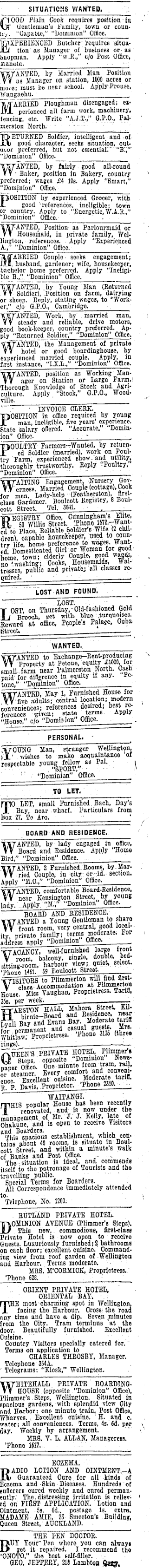 SITUATIONS Y/ANTED. ;. GOOD Plain Cook requires position in Ueutlenian'u Jb'amily, town or coun-ti-j. "Capable," "Lomimon" Office. TjYIXF-RIENOED Butoher requires eituaSll tlon as Manager of business or-as buopnian. Apply "tY.ll. t " c)o Pom Office, iianaia. • ■ ■ --■: ANTED, by Married Man Position us Manager on etation, IQOO acres or more; must be- near school. Apply Prouse, Vangaehu. ■ ARRIED Ploughman disengaged; eiperienced all farm work, machinery, fencing, etc. Write "A.J.T.," G.P.0., Pal- ' merston North. TJETURNED Soldier, intelligent and of £\> good character, seeks situation, outuyor preferred, but not essentials "B;," "Dominion" Office. WANTED, by fairly good all-found • Baker, position in Bakery, country preferred; wagee £4 10s. Apply "Smart," "Dominion" Office. TJOSITION by experienced Grocer, with JC good 'references, ineligible; town or country. Apply to "Energetic, W.A.K.," "Dominion" Office. ' ■ ' • ANTED, Position as Parlourmaid or Housemaid, in private family, Wellington, reference!. Apply "Experienced A.," "Dominion" Office. '■ MARRIED Couple- soeks engagement; husband, gardener; wife, housekeeper, bachelor home preferred- Apply "Ineligible 8.,". "Dominion" Office. WANTSD, by Young Man (Returned Soldier), Position on farm, dairyingor sheep. Reply, etating wages, to "Worker," c/o G.P.0., Cambridge. WANTED, Work, by married man, : steady and reliable, drive motors, good book-keeper, country preferred. Ap-plvJ-Returned Soldier," "Dominion" Oflice. W~ ANTKD, the Management of private hotel or good boardinghouee, by experienced married couple. Apply, in flr3t instance, "1.X.L.," "Dominion" Office. WANTED, position as Working Manager on Station or Largo Farm.' Thorough Knowledge of Stock and Agriculture. Apply "Stock," G.P.0., WoodTiUe. ' N_ * ■ ■ INVOICE CLERK. POSITION in offico required by young man, ineligible, five years' experience. State salary oflered. "Aocuratc," "Dominion" Office. : . - , POULTRY Farmers-Wanted, by returned Soldier (married), work on Poultry Farm, experienced show., and utility, thoroughly trustworthy. Reply '-'Poultry,' "Dominion" Office. ■•■■---■ ■• - IrnNG Engagement, Nnrsery Gotcrnees, Married Couple (cottage). Cook ior men, Lady-help (Foathereton), firstdaestodener. BoSlcott Registry, 8 Boulcott Street. Tel. 3841. - - . EEGIBTRY Office, Cunningham's Elite, 50 Willis Street, 'Phone IW2--f anted to Place, Reliable Soldier's-Wife (2 children), oapanlo housekeeper, used to countrv life, home preference to wages. Wanted Domesticated Girl or Woman for good home, town; elderly Couple, good wages, no ' washing; Cooks, Housemaids, Waitresses, public and private.; all classes rcquired. ■ ■ ■ "Tost amp found. LOST, on Thursday, Old-faßhioned Gold Brooch, »*t witi blue-.turQUeiMe. Eeward at. office. People's Palate, Ouba Street. ' ■ WANTEO. WANTED to Exchange-Rent-producing Property at Petone, equity £IMO, for small-farm near Palmeraton North. Cash paid , for diHerence in equity if any. retone ANTED, May 1, Furnished Houso for fivo adults; central location; modern conveniences; references doßircd; beat refOrcnces -given; irtate terms. Apply "Houbc," c/o "Domiraon" Office. . PERSONAL. - ;VOUNG Man, etronger Wellington, I'JL' wishes to moko aoquaintanoe of respectable young fellow as Pal. \ . "SPORT," -■■■--■ ,i : "Dominion" Offlce. TO LET. rriO LET, small Furmeticd. Bach, Day's X Bay, near wharf. Particulars from box 27. Te Aro. - ' . BOARD AND RESIDENCE. ANTED, by lady engaged in office, Board and Residence. Apply "Home Bird," "Dominion" Offloe. . ANTED, 2 Furnished.Rooms, by. Mar- . ricd Couple; in oity.-dr Id. section. Apply "M.0.," WANTED, comfortable Board-R«aidonce, near Kensington Street, by young lady. ..Apply. "M.," "Dominion" Office. BOARD AND RESIDENCE. WANTED a Young Gentleman to share front room, very central, goodlocal-. ity, private family;.terms For , address apply "Dominion Office, , VACANCY, welMurntahed large front room, balcony, single, double, bedBittinß°?oom, harbour view; quiet, eeleot. ■7ff °°° -w Tiimloott Street. —181TOR8 to Plimmerton wui nna flrstclase Accommodation at PUmm.rton House Miss Vaughan. Proprietress, Tanfl. k<. ner week. : ttt*tiSTON HALL, Mahora Street, KilWhitlaw; Proprietress. 'Phone 3136 (three iinge). ' : :— PRIVATE HOTEL PUmmerV Q sTeps oppoßite ';i>ominion" NewsOffice One minute from tram, rail, Kramer Every oomfort and conveniluc tea ExceUent V o'ulsine. Modemte tari«. It P. Davis. Proprietor. 'Phone 2310. -■ WAITANGI. ■ mHIS popular House has been recently I renovated, and is now under the management of Mr. J. J. Kelly, late of Ohakune, arid is open to receive Visitors and Boarders. This spacious establishment, which contains about 40 roomß, is situate in Boulcott Street, and within a minute's walk of Banks and Post Office. . s The situation is ideal, and, commends itself to the patronage of Tourists and the travelling public. ,'"'■ Special Terma for Boarders. All Correspondence immediately attended to. Telephone, No. 1200. ' RUTLAND PRIVATE HOTEL. DOMINION AVENUE (Plimmer'a Bteps). This new, commodious, firstolasa Private Hotel is now open to receive Guests. Luxuriously furnished; 2 bathrooms on each floor; excellent cuisine. Commanding view from roof garden of-Wellington and Harbour. Terms moderate. MRS. M'CORMIOK, Proprietress. 'Phone 628. : ORIENT PRIVATE HOTEIi, ORIENTAL BAY. ; rE most oharming spot in Wellington, facing tho Harbour. Cross/ the road any time and have n, dip. Seven minutes from the City. Train tennlnuß 'at the door. Beautifully furnished. Excellent Culeinc. "■'.■• Country Visitors specially catered for." Terms on application to CHARLES THROSBY, Manager. Telephone 354 A. ' Telegrams: "Kiosi," Wellington. HITEHALL PRIVATE BOARDINGffOUSE (opposite "Dominion" Office), Plimmer's Steps, Wellington. Situated in spacious gardens, with splendid view Oity and Harbor: one minute train, Post Office, Wharvcß...'.