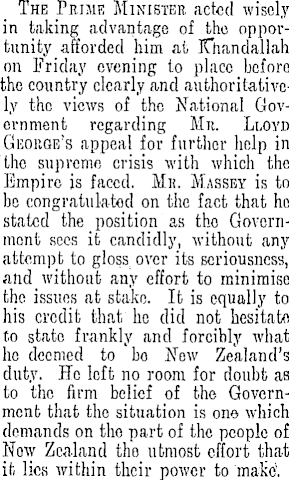 The Prime Minister, acted wisely in taking advantage of the opportunity afforded him at iChandallah on Friday evening to place before the country clearly and authoritatively the views of the National Government regarding Mr. Lloyd George's appeal for further help in the supreme crisis with which the Empire is faced. Mr. Massey is to be congratulated on the fact that he stated the position as tho Government sees it candidly, without any attempt to gloss, over its seriousness, and_ without any effort to minimise the issues at stake. It is equally to his credit that lie did not hesitate to state frankly and forcibly what he deemed to ho New Zealand's duty. Ho left no room for doubt as to the firm belief of the Government that the situation is one which demands on tho part of the people of Now Zealand tho utmost effort that it lies within their power to make'.